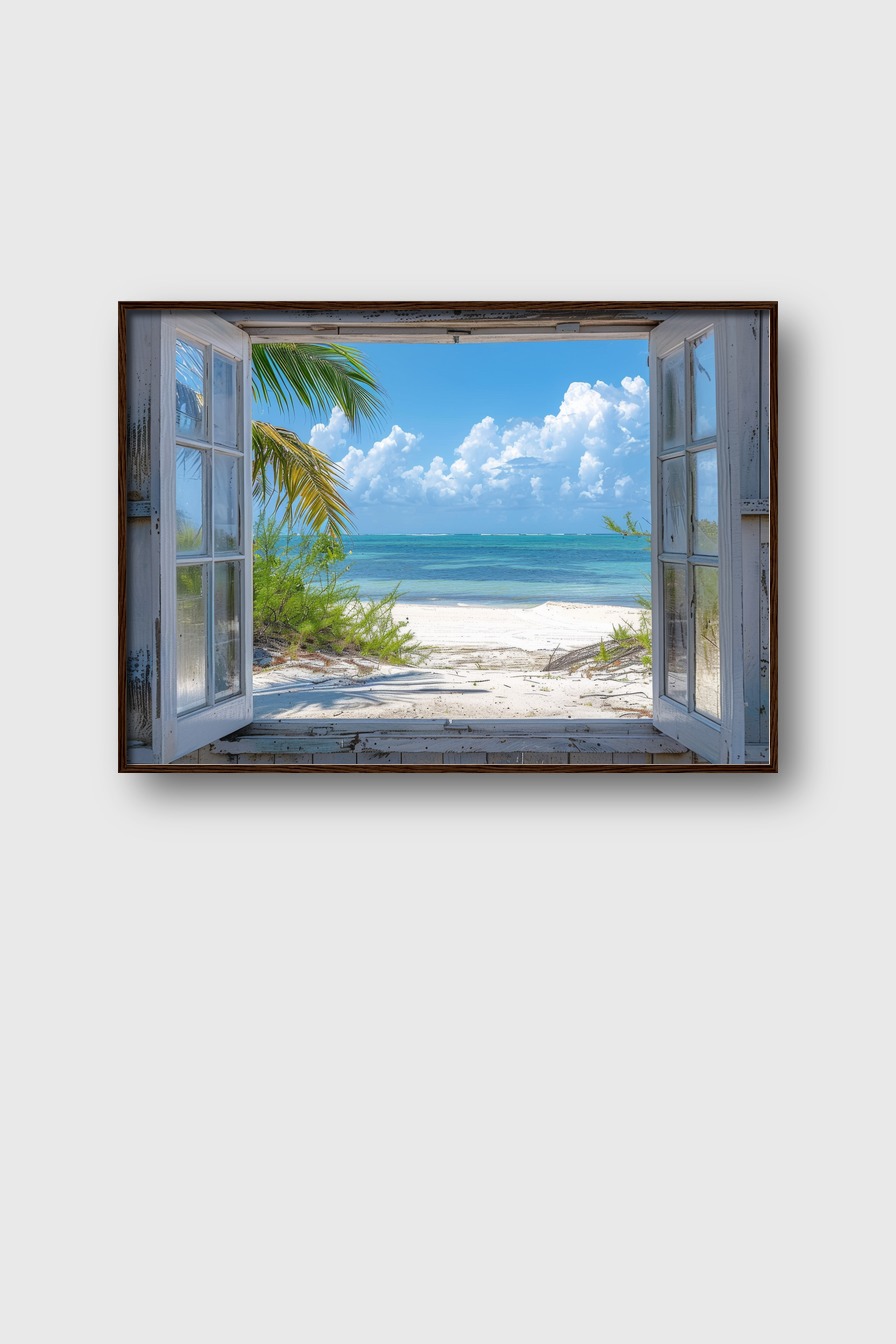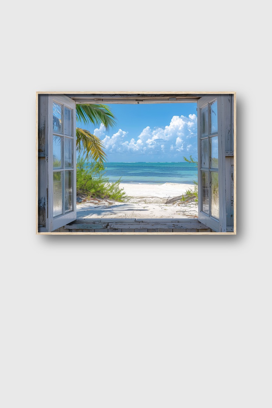 Das offene Fenster schiebt sich in den Raum. Blick trifft rau verwitterten Holzrahmen und dahinter die Stille vom Strand und Ozean. Raum wird zur Flucht.