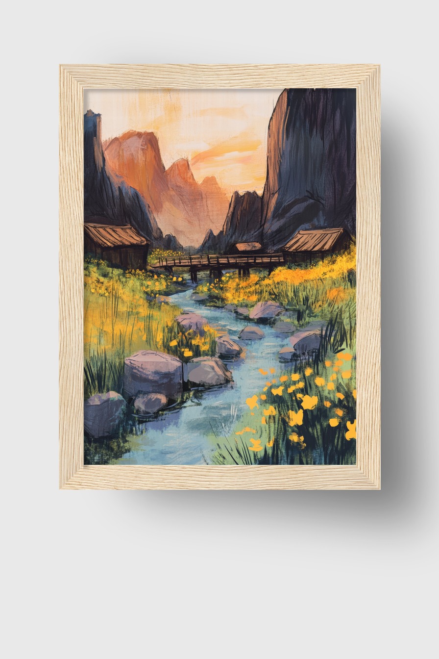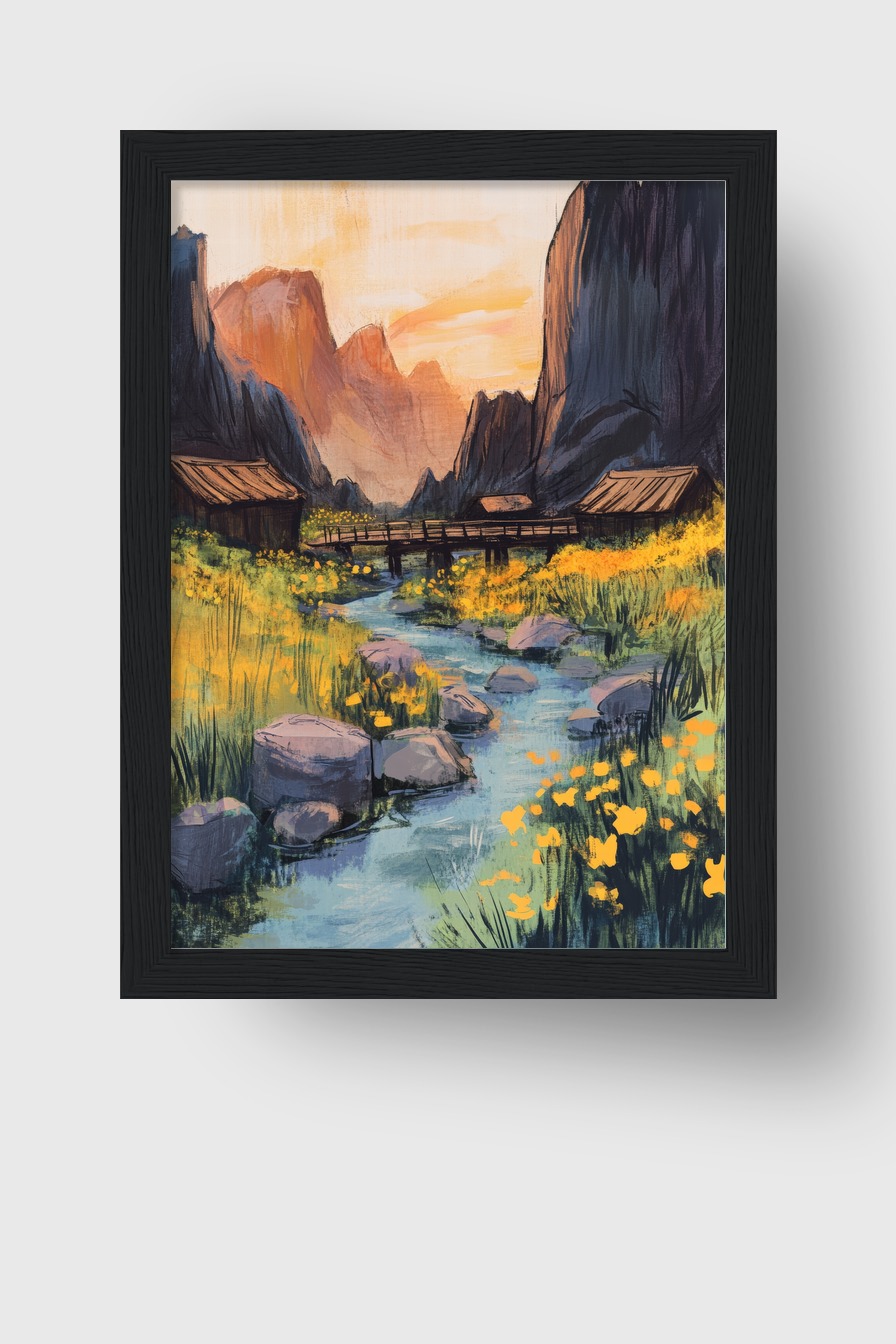 Dieses Bild zeigt ein Bergtal mit einem kleinen Fluss und blühenden gelben Blumen. Im Hintergrund sind zwei Holzhütten und eine Hängebrücke vor hohen Bergwänden zu sehen.