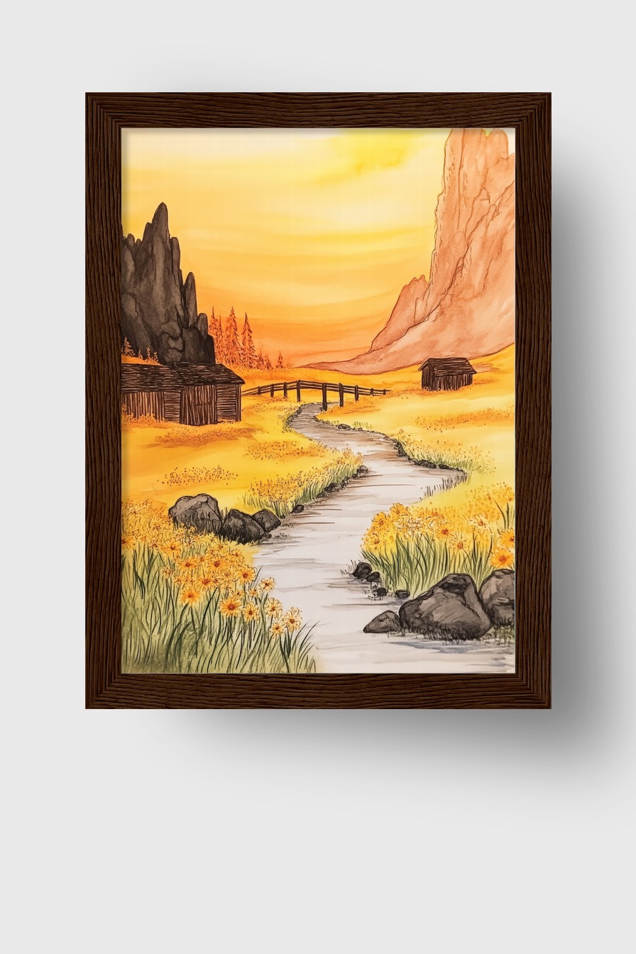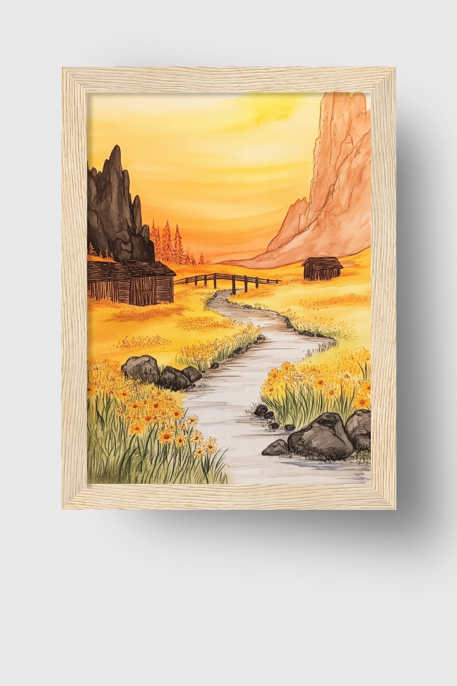 Poster mit herbstlicher Landschaft, Fluss und Weg zwischen Bergen, warmen Gelb- und Orangetönen im Aquarellstil