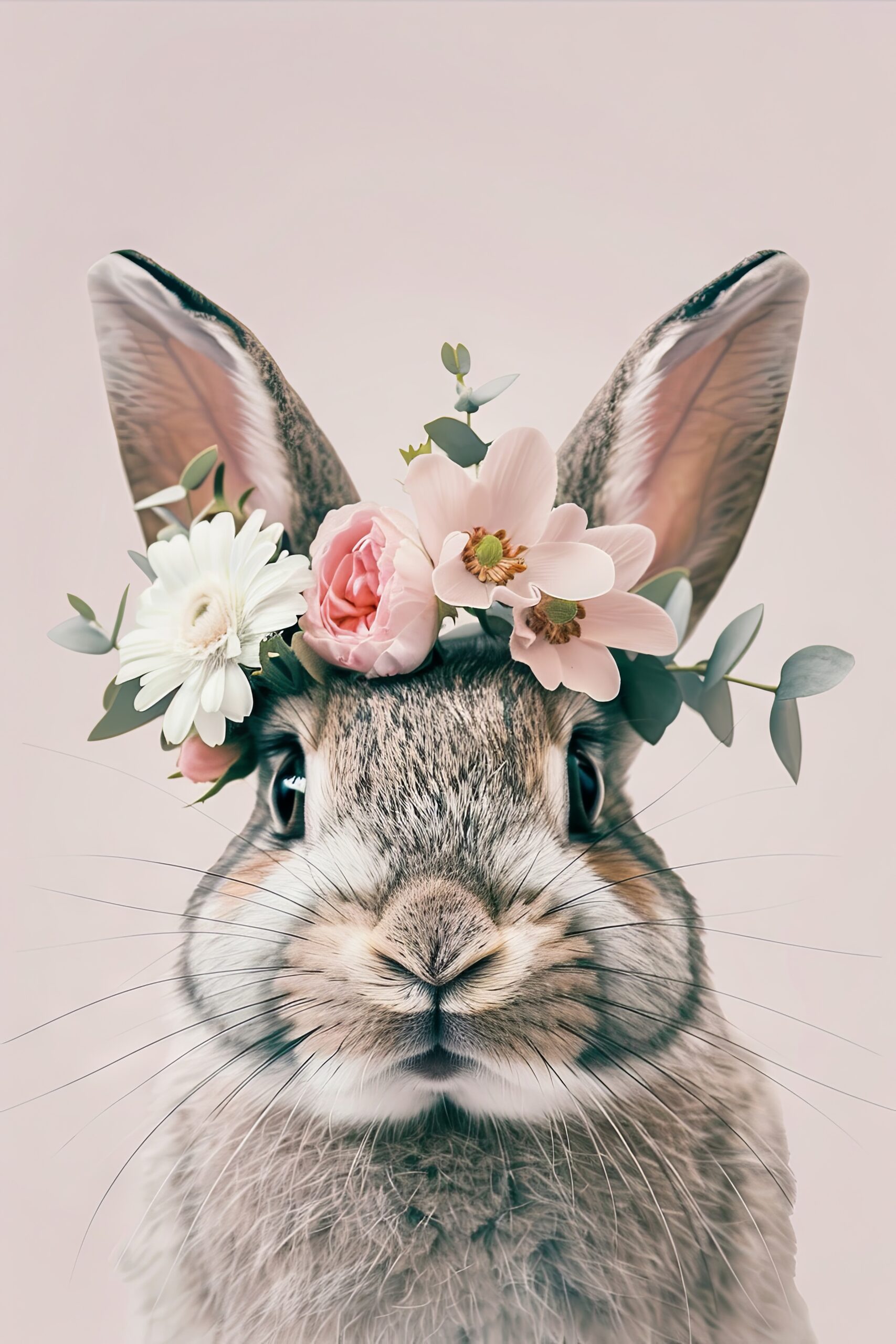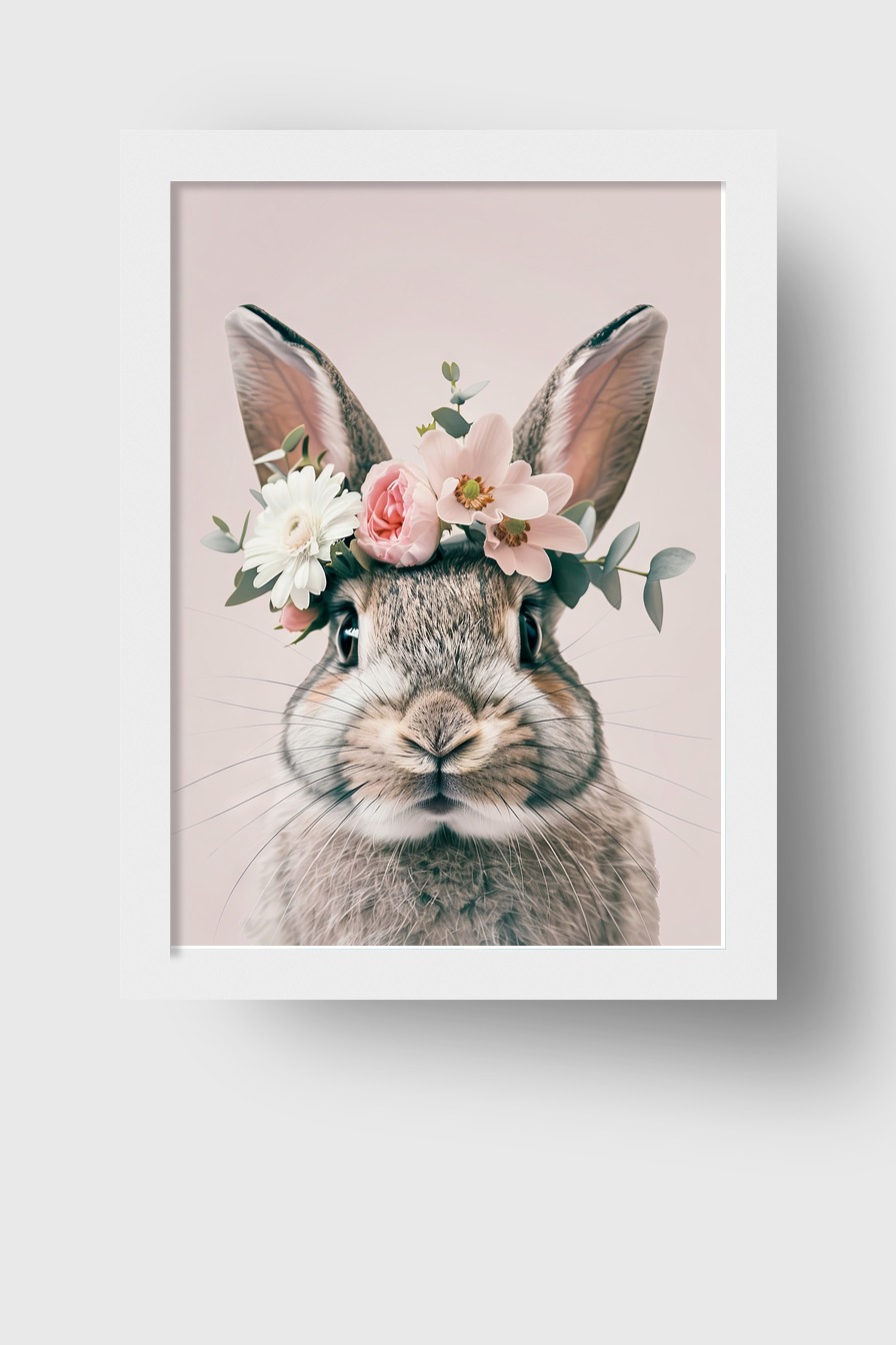 Motiv wirkt frisch und freundlich, Fokus auf Kaninchen mit kunstvollem Blumenkranz im Raum