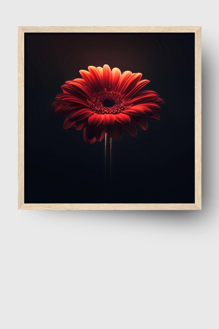 Gerbera rot auf halbmattem Posterpapier (170 g/m², FSC-zertifiziert), hinter bruchsicherem Plexiglas. Rahmen aus FSC-zertifiziertem Kiefernholz, erhältlich in verschiedenen Farben. Fertig zum Aufhängen inklusive Set.
