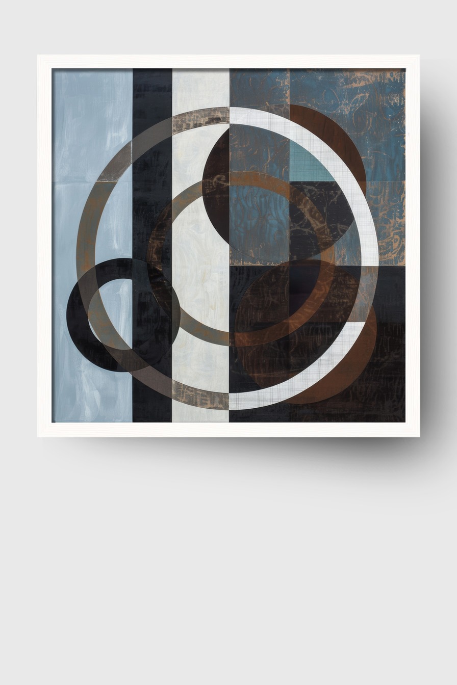 Die Verbindung von Ringen und Quadraten ergibt ein strukturiertes, grafisches Bild mit klaren Formen und Linien.