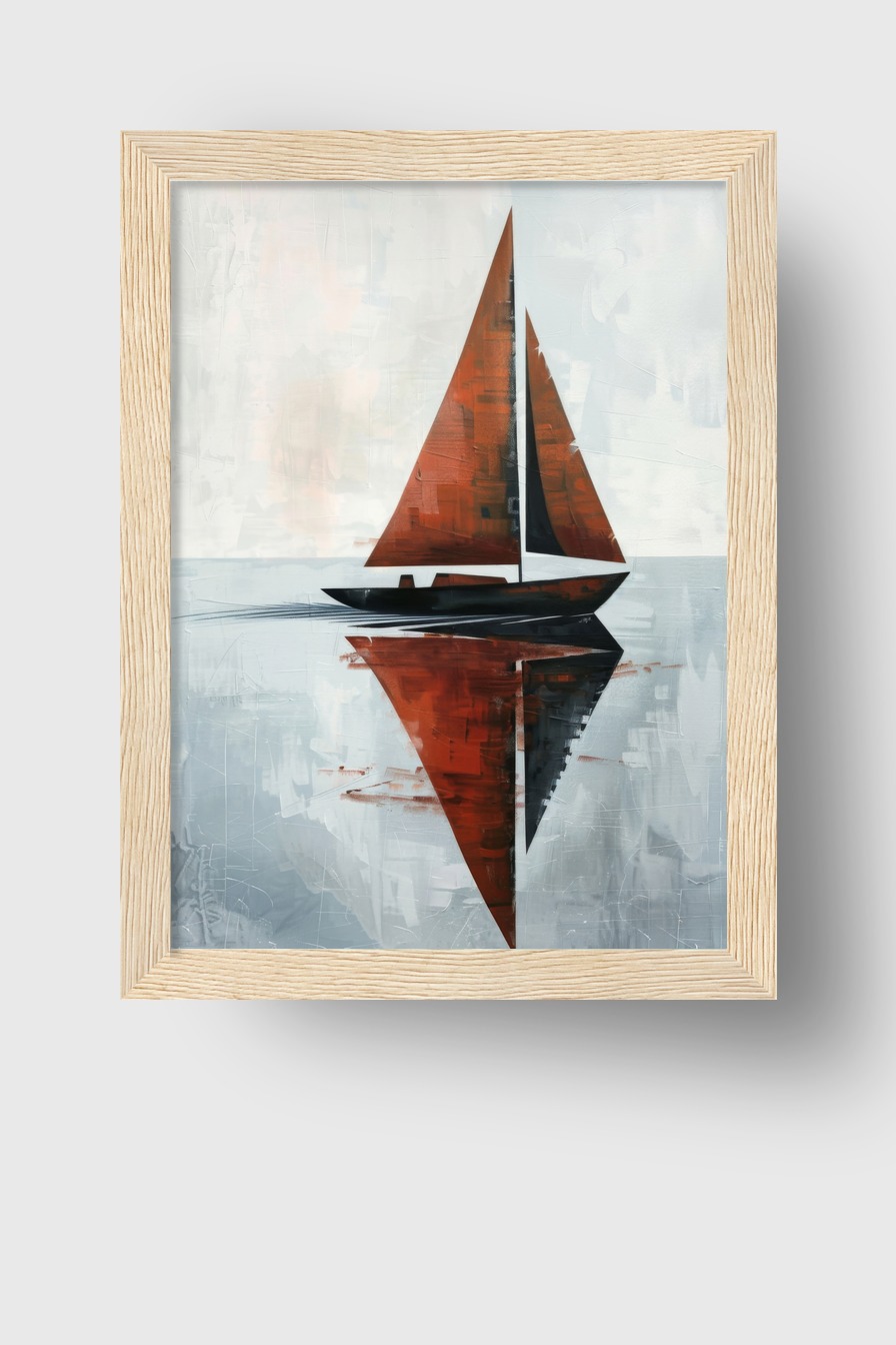 Das Motiv entfaltet zusammen mit dem Rahmen eine beruhigende Wirkung im Raum. Die klare Form des Segelbootes und die reflektierende Wasseroberfläche schaffen eine Atmosphäre von Weite und Ruhe, zieht den Blick an und verleiht Tiefe.
