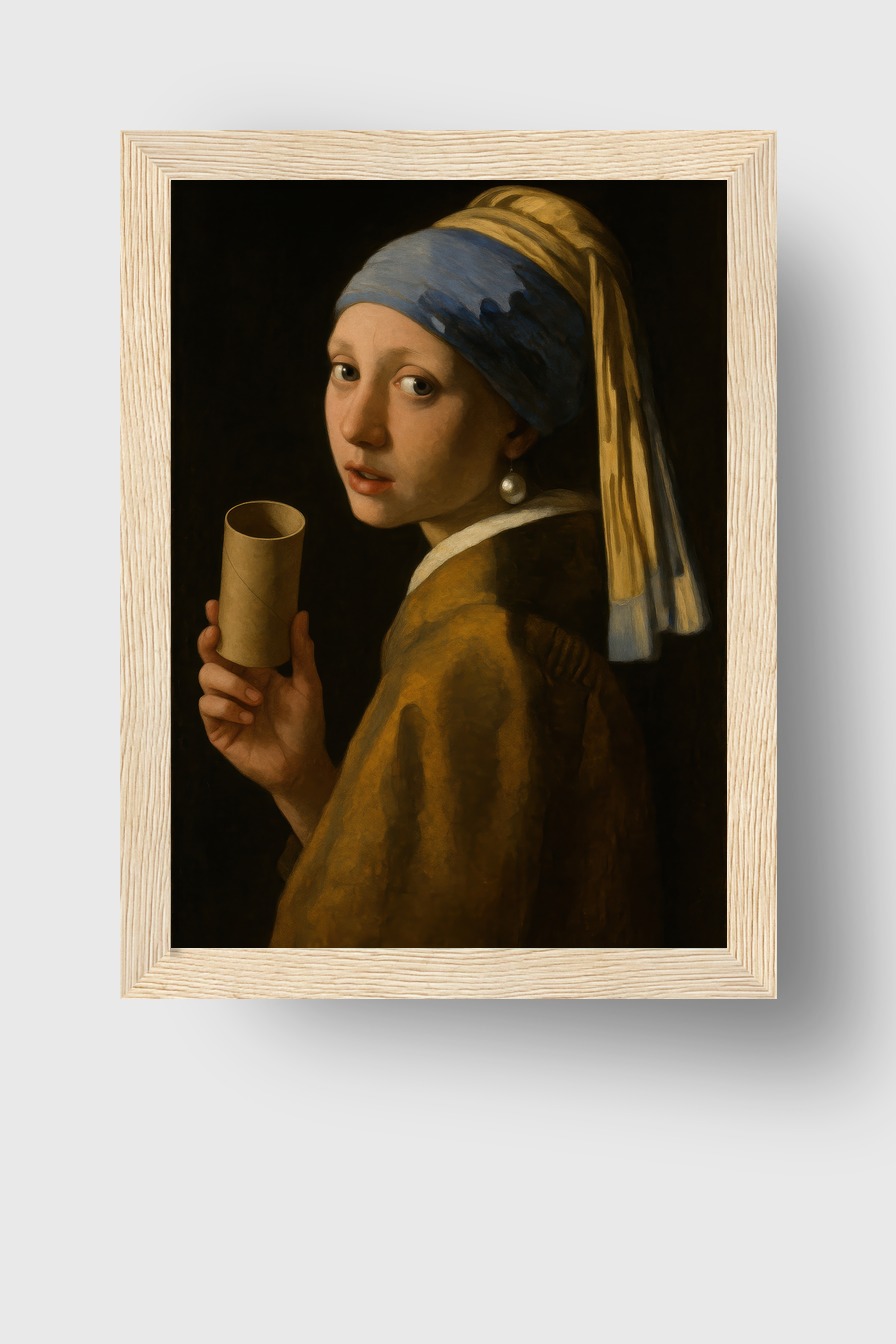 Poster auf 170 g/m² halbmattem Papier mit Perlenohrring und Kopftuch. Hinter bruchsicherem Plexiglas in einem FSC-zertifizierten Kiefernholzrahmen. Erhältlich in Schwarz, Weiß, Naturholz und Dunkelbraun. Fertig zum Aufhängen.