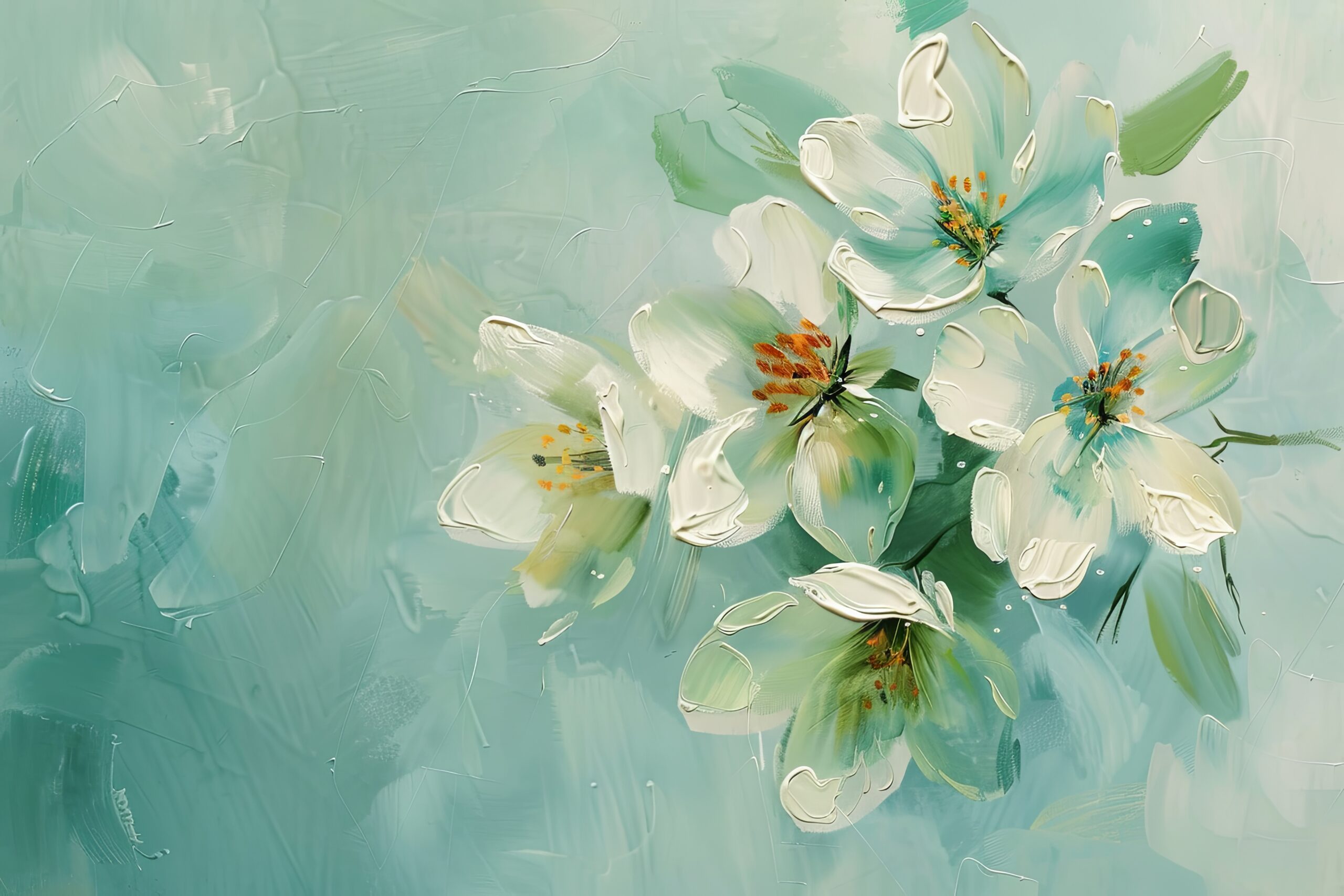Das Bild zeigt einen Blütenzweig mit betonten Staubgefäßen in zartem Weiß und Grün, wirkt ruhig im Raum.
