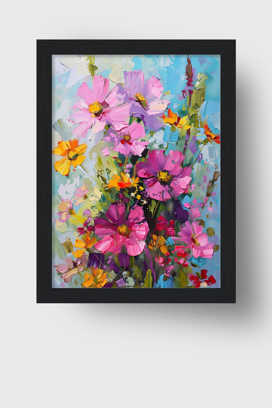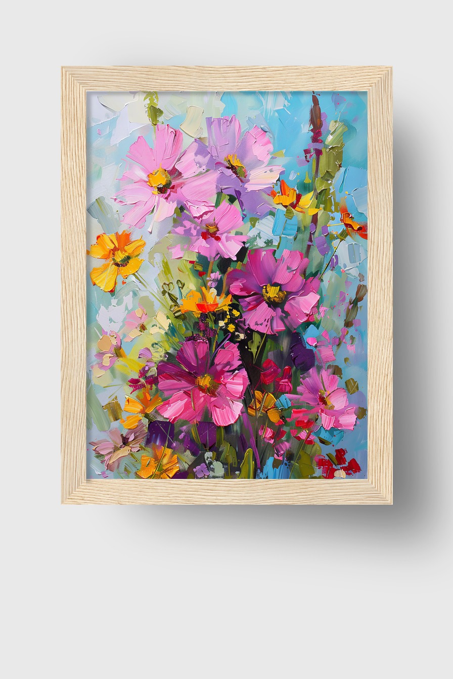 Im Raum entfalten sich die kräftigen Farben und die Spachteltechnik zieht den Blick an. Der Strauß wirkt wie ein Moment eingefrorener Natur, der die Wand mit Energie füllt. Die Detailvielfalt lädt zum näheren Betrachten ein.