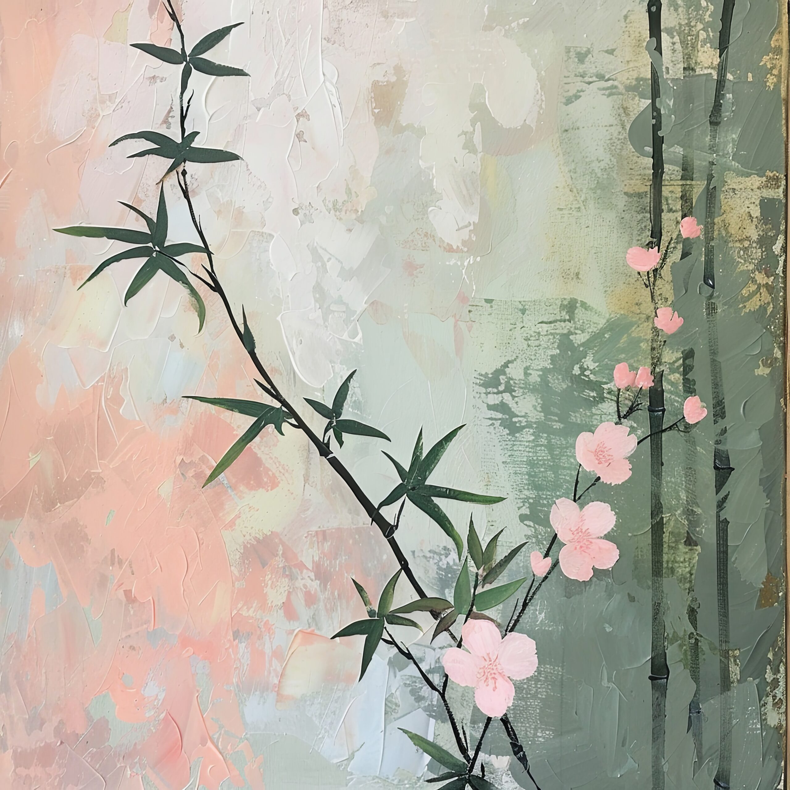 Im Raum entfaltet sich der sanfte Kirschblütenzweig als dezenter Blickfang, dessen rosa Blüten und grüne Blätter dem Umfeld eine frische und ruhige Atmosphäre schenken.