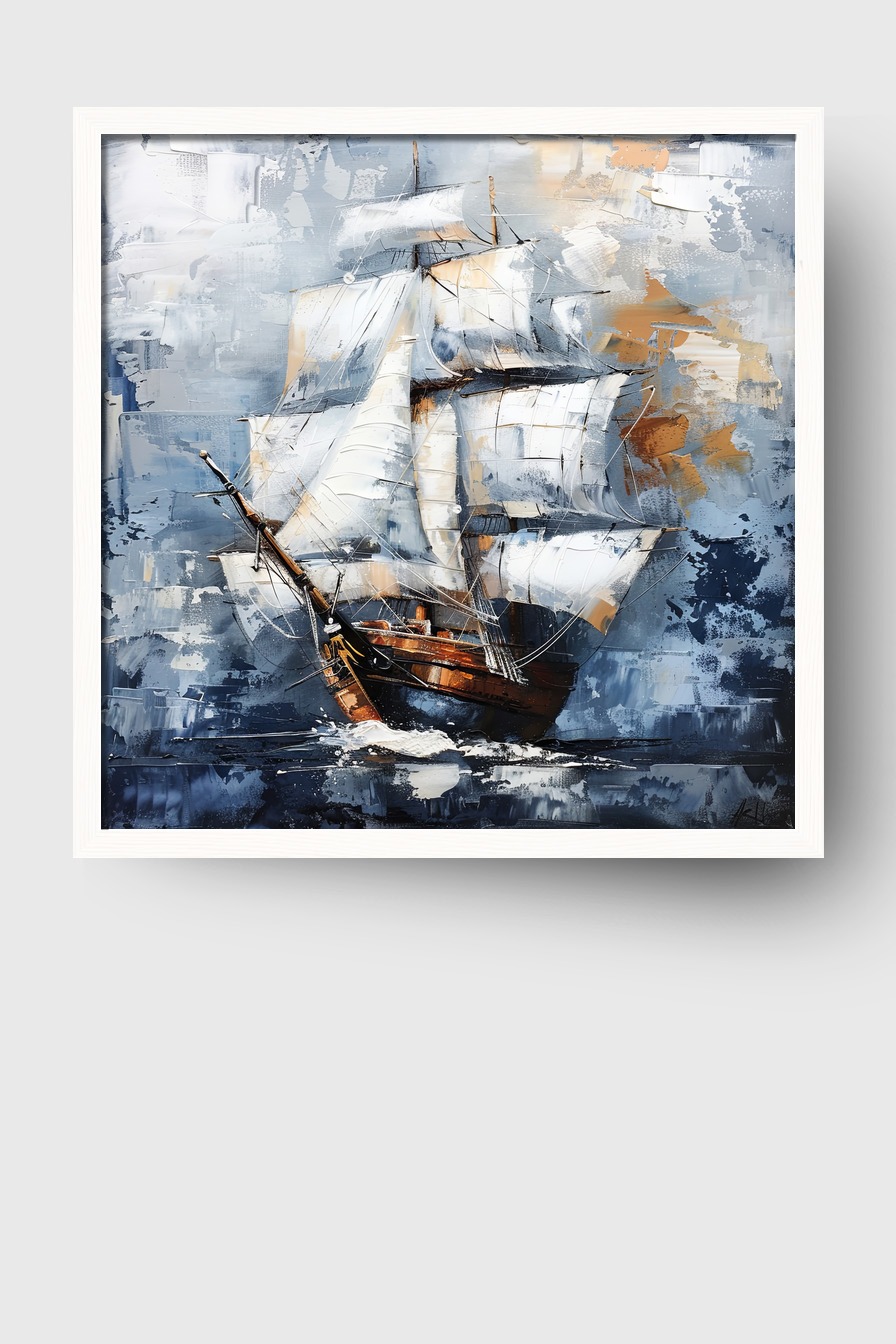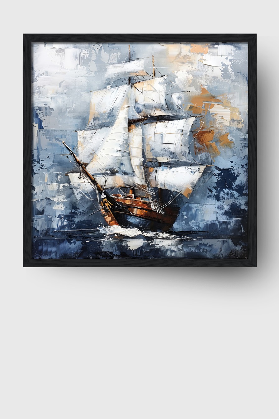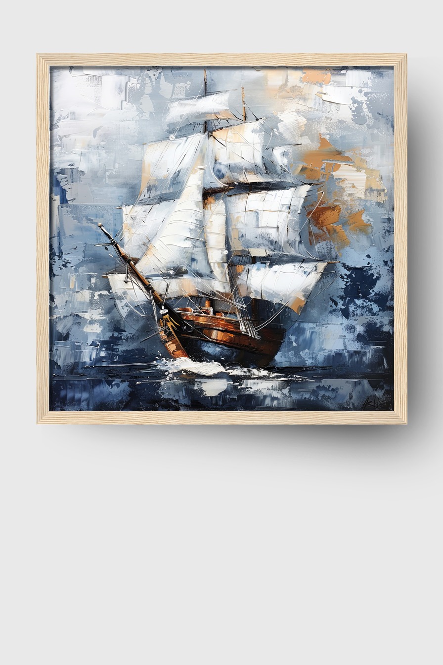 Das Bild erzeugt eine lebendige maritime Atmosphäre und bringt Bewegung in den Raum. Die Farben und Formen lassen das Segelschiff kraftvoll erscheinen.