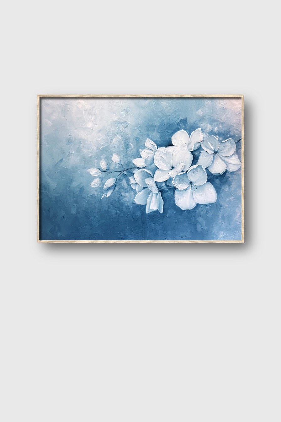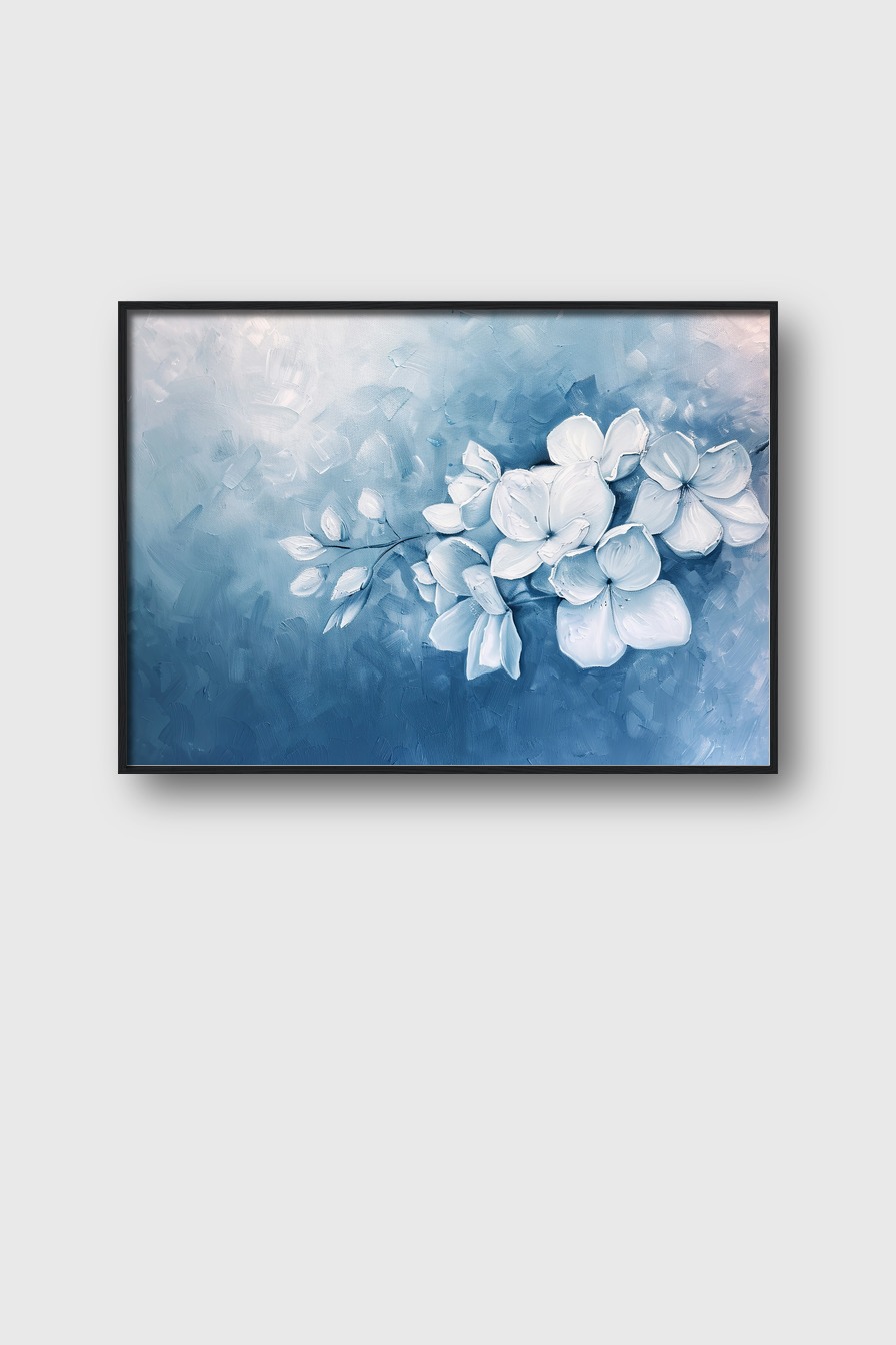 Im Raum sorgt das Motiv für eine elegante und zurückhaltende Atmosphäre. Die klaren Formen der Blüten setzen einen dezenten Akzent, der mit kühlen Farbtönen ein Gefühl von Frische und Gelassenheit erzeugt. Die leichte Struktur der Malerei wirkt lebendig und einladend.