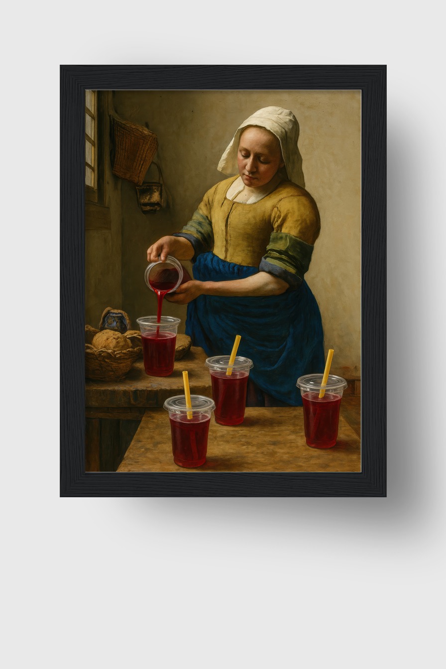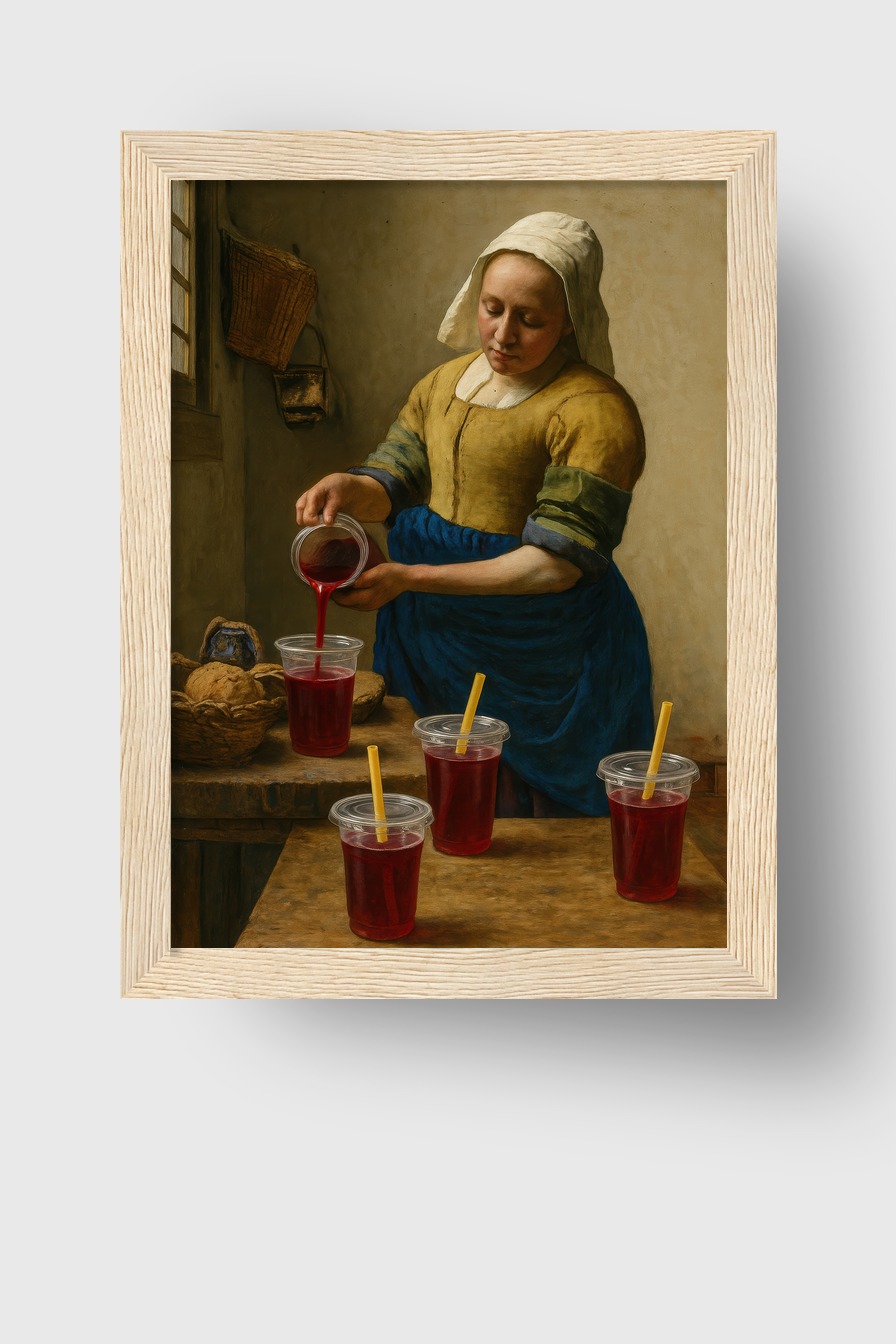 Das Bild zeigt eine Frau beim Einschenken von Saft. Gedruckt auf 170 g/m² halbmattes Papier hinter bruchsicherem Plexiglas. Der Kiefernholzrahmen (FSC-zertifiziert) ist in Schwarz, Weiß, Naturholz und Dunkelbraun erhältlich. Fertig zum Aufhängen, inklusive Aufhängeset.