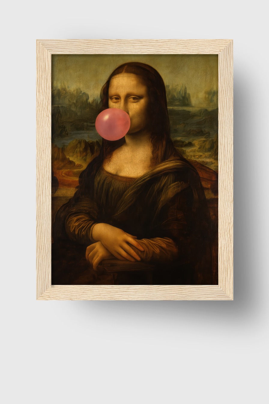 Das ikonische Bild von Mona Lisa mit aufgesetztem Kaugummi hinter bruchsicherem Plexiglas. Gefasst in einen Kiefernholzrahmen (FSC-zertifiziert), in Schwarz, Weiß, Naturholz oder Dunkelbraun. Fertig zum Aufhängen inklusive Set.