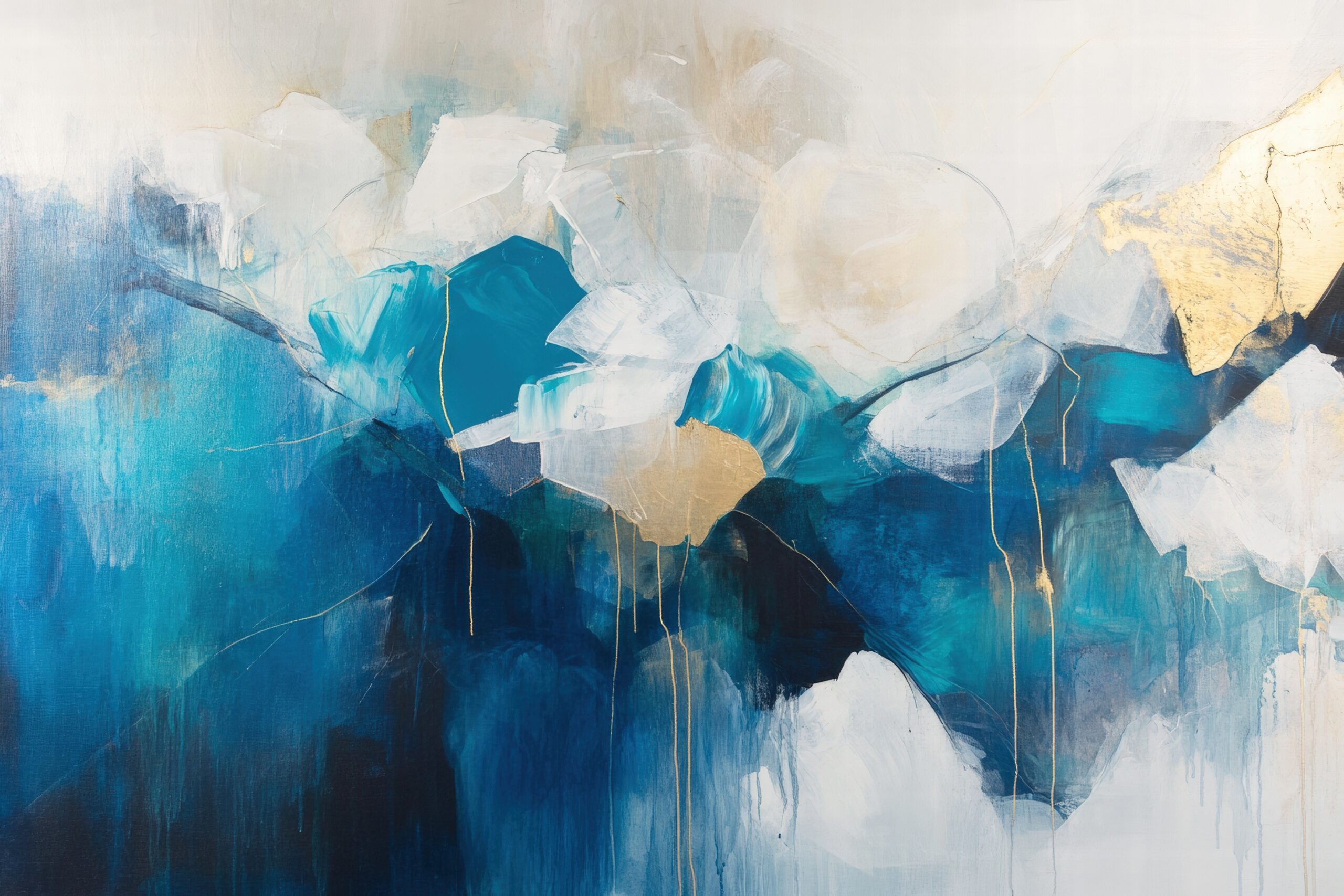 Abstrakter Kunstdruck mit blauen, weißen und goldenen Farbfeldern, die eine Berglandschaft stilisiert darstellen, Poster für moderne Wohnräume