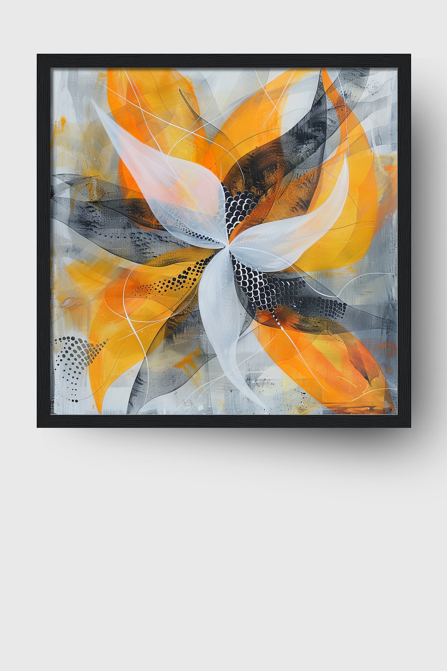 Das Bild zeigt eine abstrakte Blüte in kräftigen Orangetönen und dezentem Grau. Die dynamische Komposition verbindet organische Formen mit geometrischen Mustern.