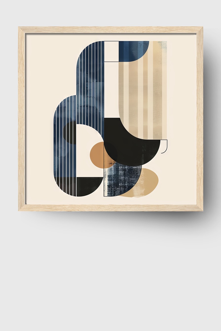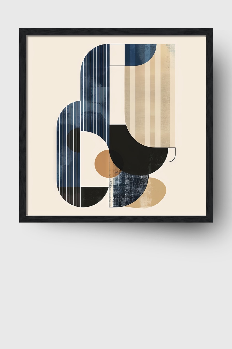 Dieses Motiv zeigt abstrakte geometrische Formen in Beige, Schwarz und Blau. Die klaren Linien und Kreise schaffen eine moderne Komposition.