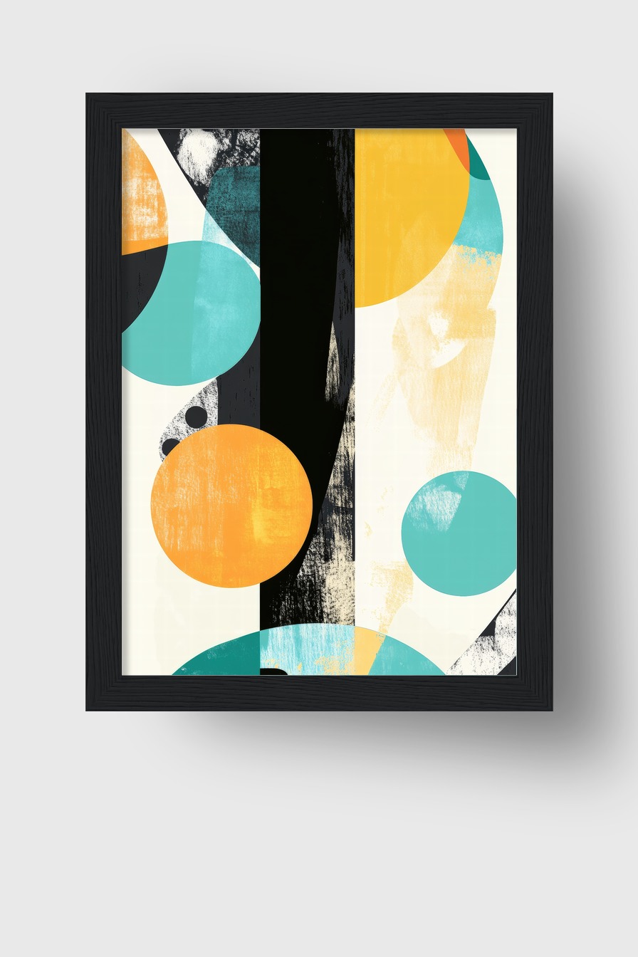 Dieses Motiv zeigt abstrakte Kreise in Orange und Türkis mit einem schwarzen senkrechten Balken. Die Farben sind kräftig und die Formen klar definiert.