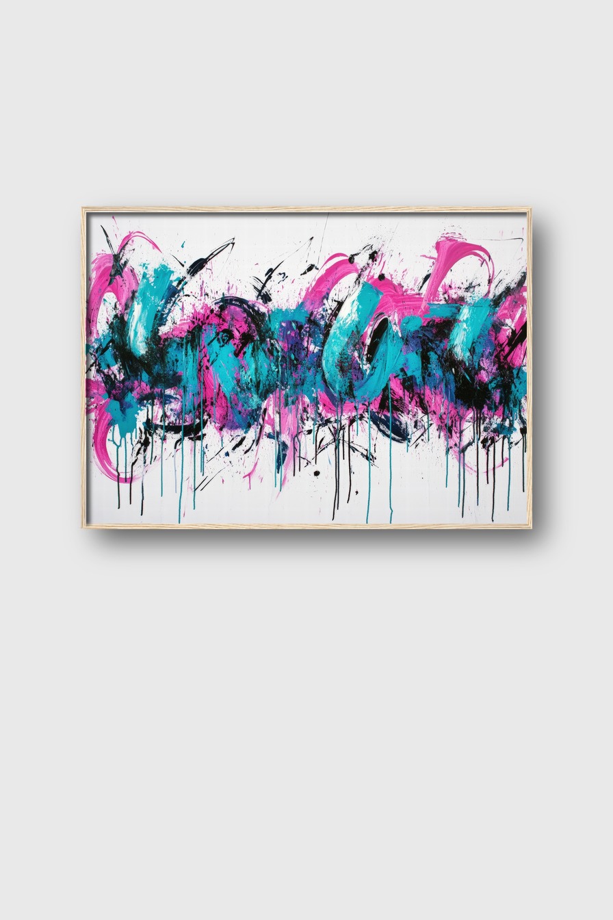 Das Bild zeigt einen lebhaften Farbfluss in Pink und Türkis, der durch schwarze Akzente ergänzt wird. Die dynamischen Pinselstriche wirken wild und spontan auf hellem Hintergrund.