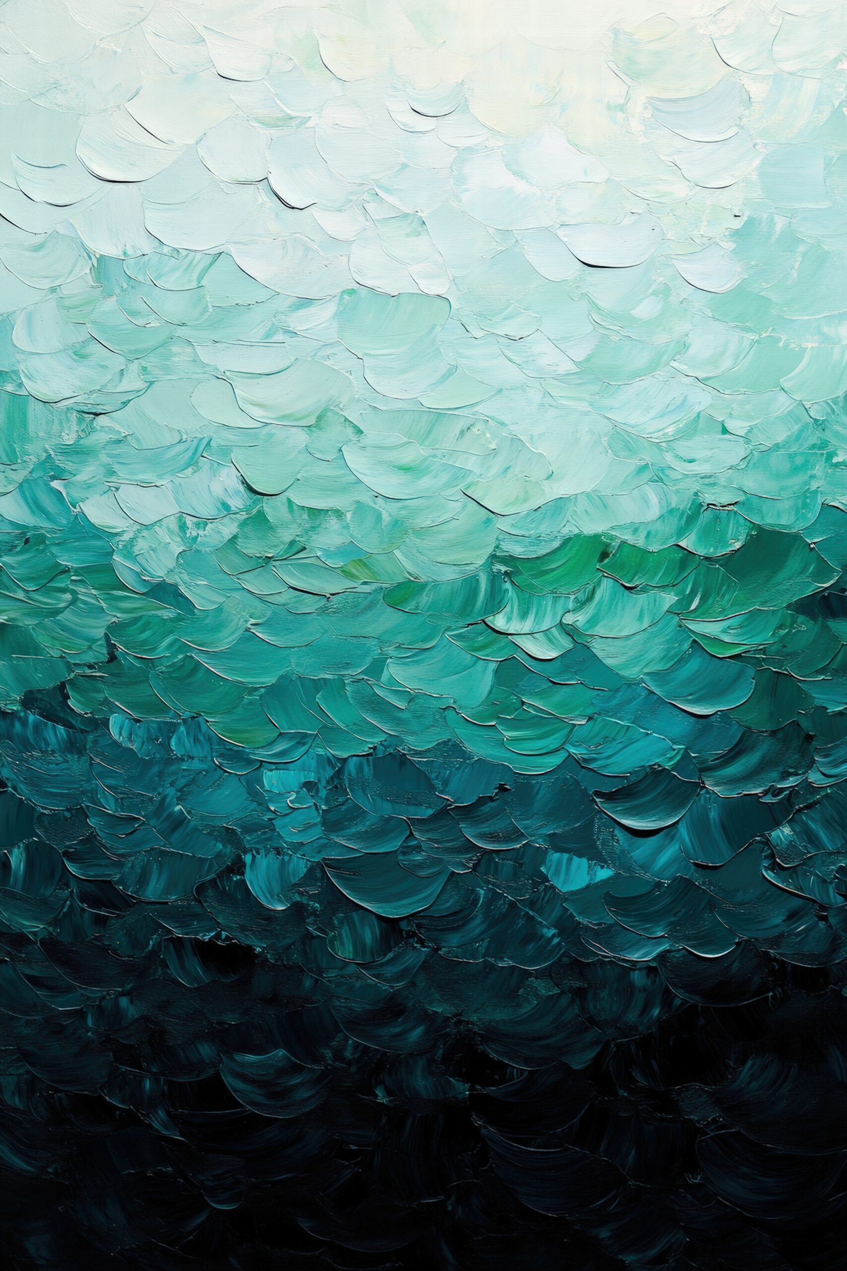 Dieses Bild zeigt einen sanften Farbverlauf von Weiß über verschiedene Grüntöne bis zu Dunkelgrün. Die dicken Pinselstriche erzeugen eine ausdrucksstarke, strukturierte Oberfläche.