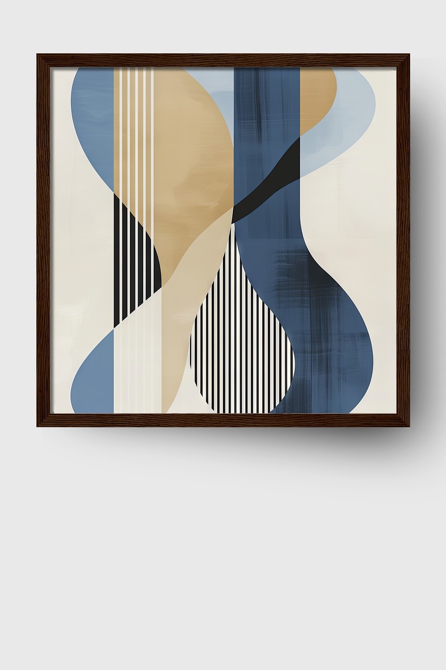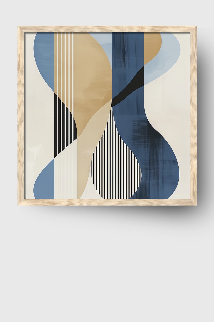 Abstraktes Poster mit fließenden Formen in Blau und Beige, Linien und organischen Flächen auf halbmattem Papier