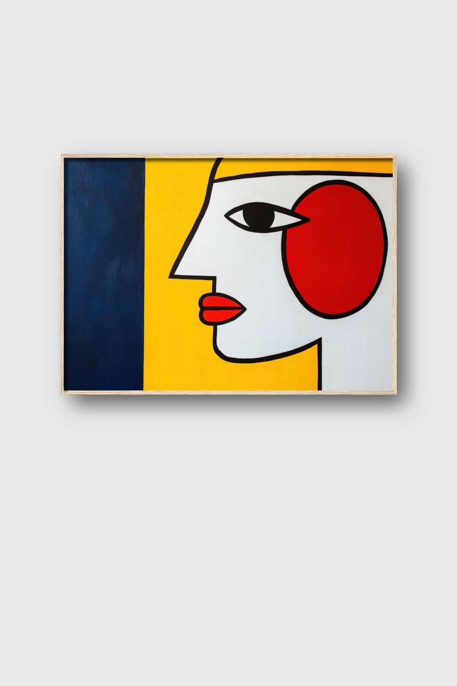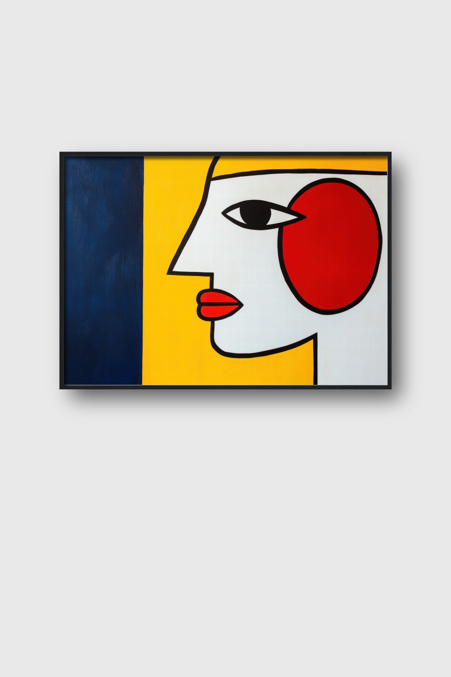 Grafischer Kunstdruck mit stilisiertem Frauenprofil in Rot, Gelb und Schwarz als Poster mit klaren Linien