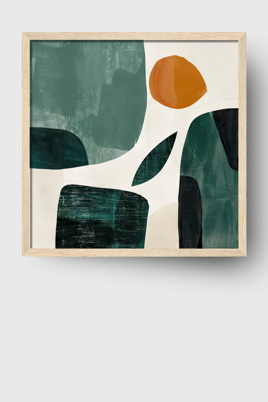 Abstraktes Kunstdruck mit grünen und orangen geometrischen Formen auf hellem Hintergrund