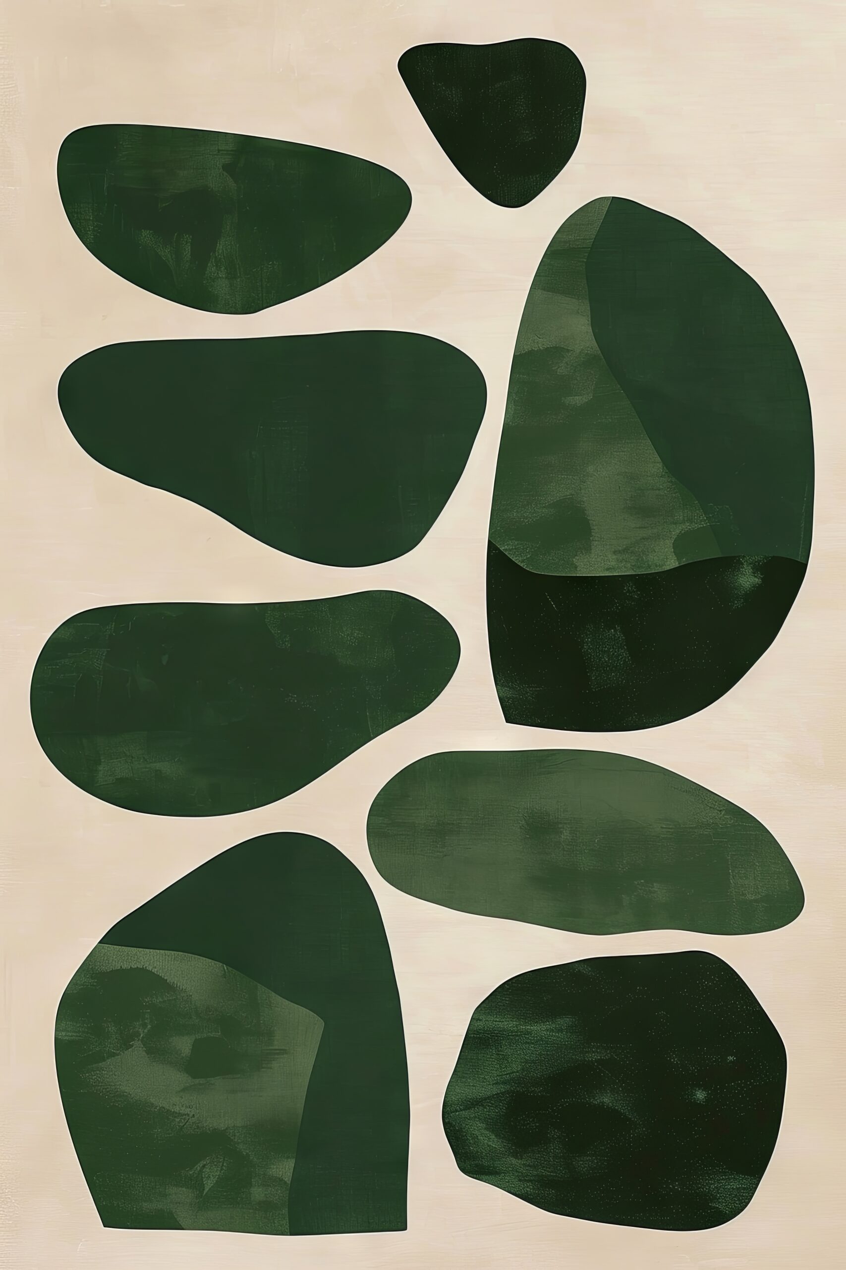 Die Grafik zeigt abstrakte, organische grüne Formen auf einem hellen, beigefarbenen Hintergrund. Das Motiv wirkt ruhig und modern durch seine reduzierte Farbgebung und klare Anordnung.