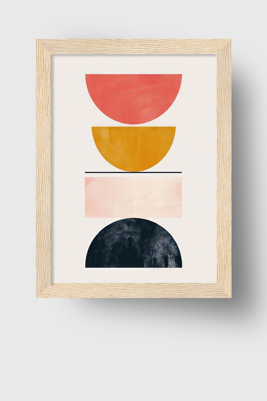 Das Motiv zeigt eine reduzierte Komposition aus farbigen Halbkreisen und einem Rechteck. Die Farbwahl aus Rot, Gelb, Rosa und Schwarz schafft eine klare, moderne Ästhetik.
