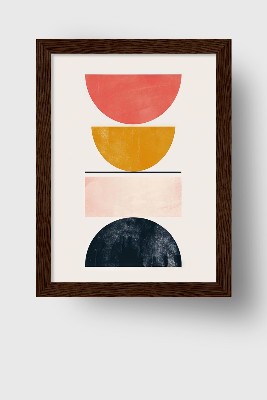 Auf halbmattem 170 g/m² FSC-Papier gedruckt, hinter bruchsicherem Plexiglas in einem Kiefernholzrahmen. Die minimalistischen Halbkreise erscheinen klar und strukturiert. In verschiedenen Rahmenfarben verfügbar, fertig zum Aufhängen.