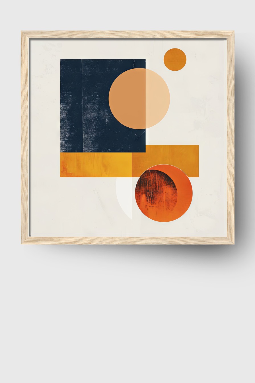 Abstrakter Kunstdruck mit geometrischen Formen aus Kreisen und Quadraten in Orange und Dunkelblau als Poster