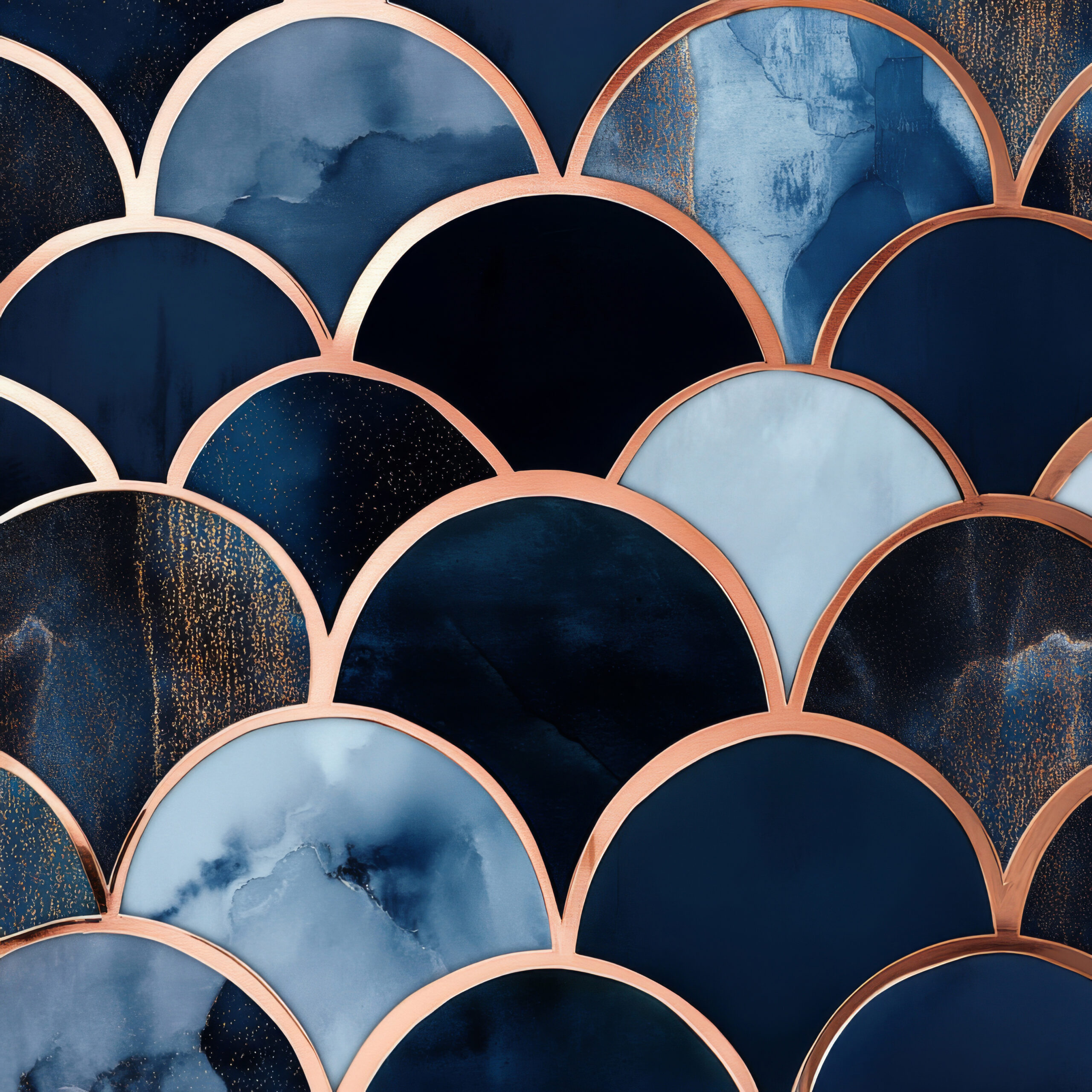 Abstraktes Poster mit kupferfarbenen Schuppenbögen auf blauem Hintergrund, geometrischer Kunstdruck mit klaren Farbübergängen