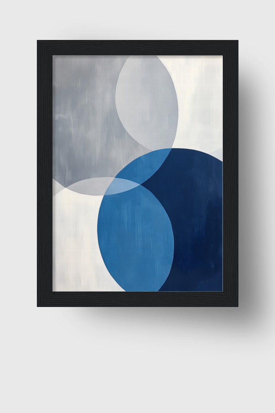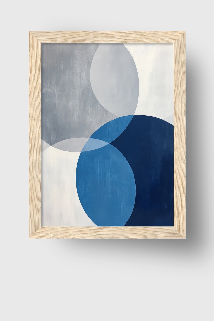 Abstraktes Poster mit überlappenden Kreisen in Blau- und Grautönen, klare Formen ohne Glanzeffekte