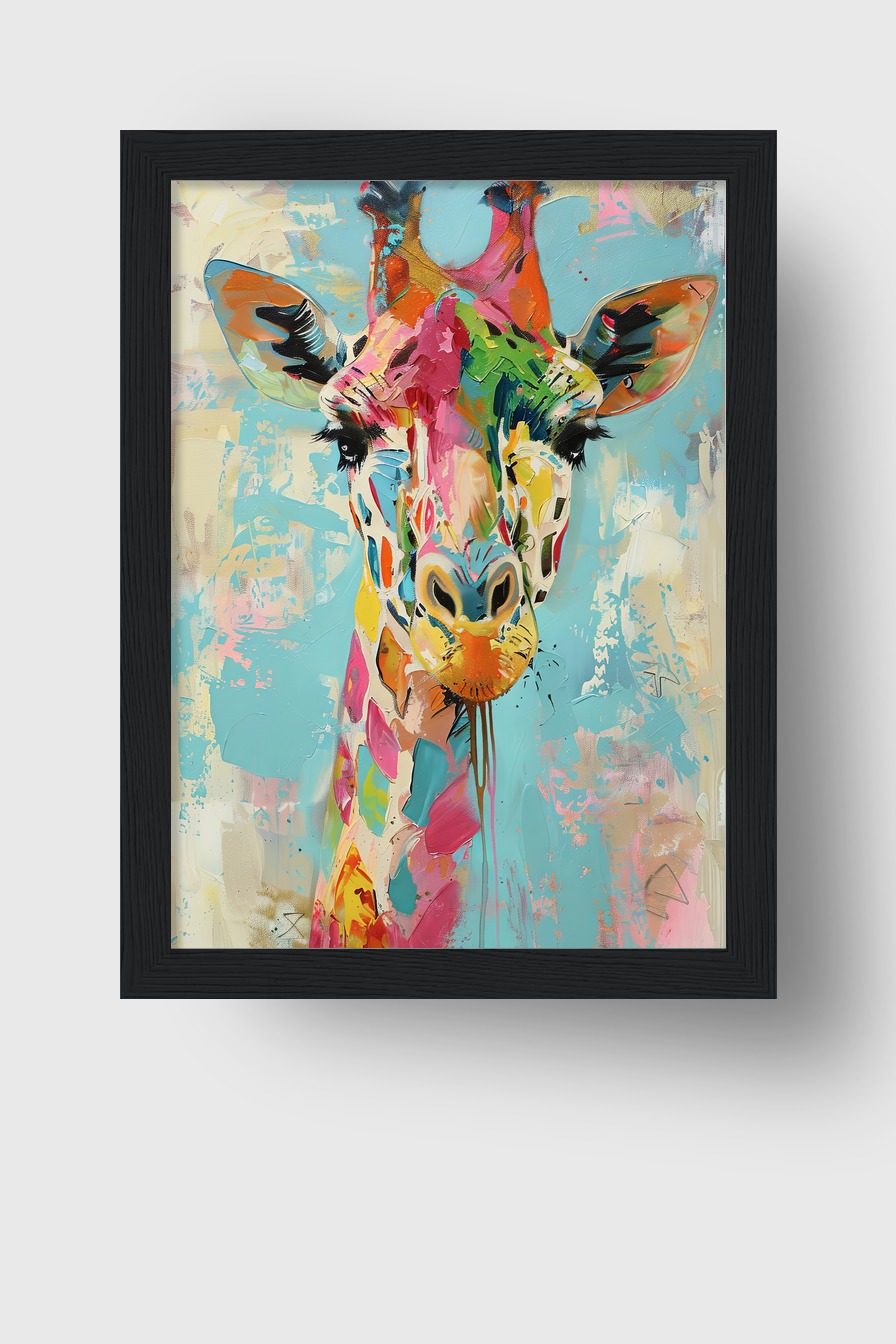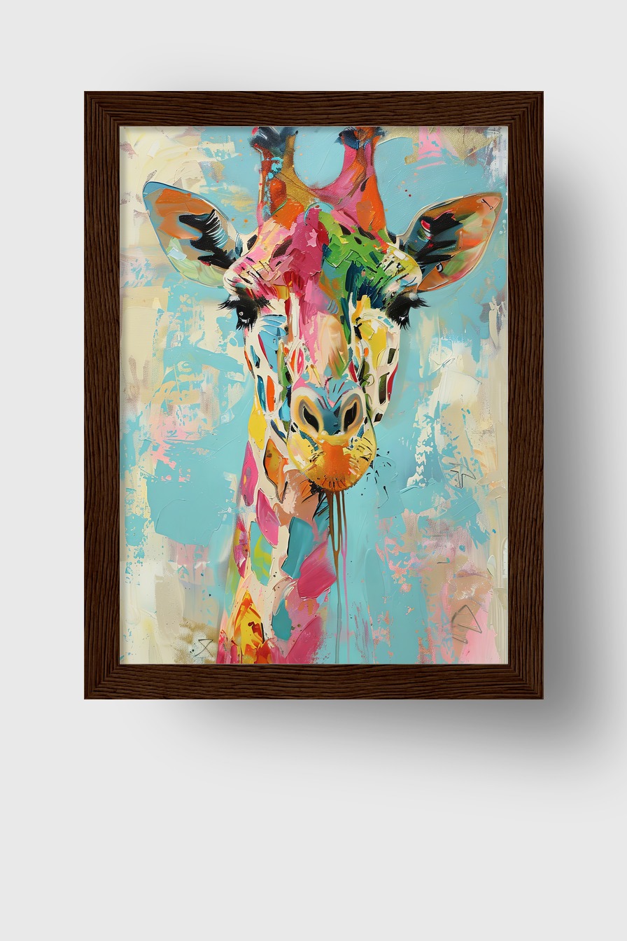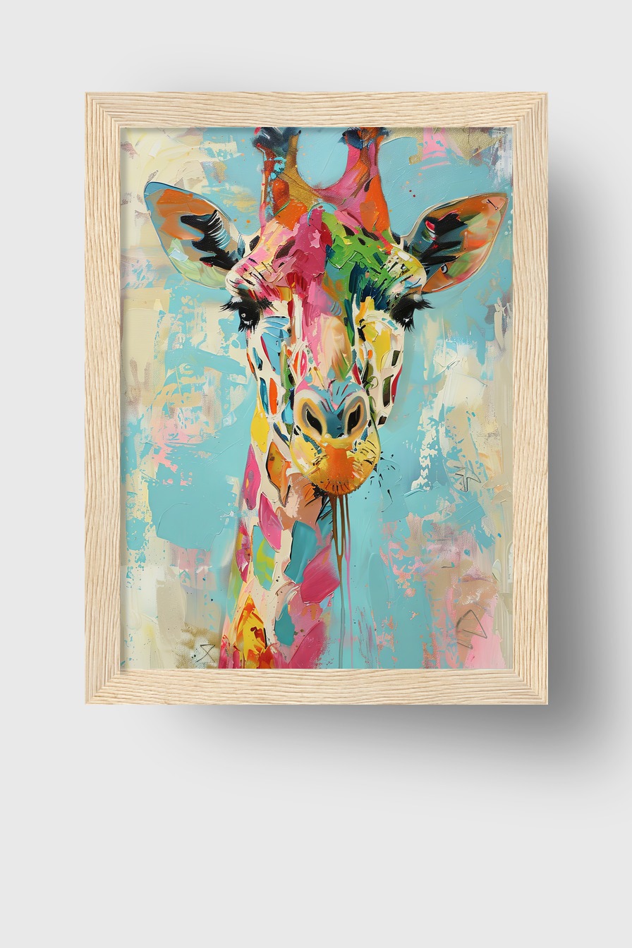 Farbenfrohe Giraffe als Poster auf 170 g/m² FSC-zertifiziertem Papier hinter bruchsicherem Plexiglas. Im Kiefernholzrahmen mit Aufhängeset, erhältlich in Schwarz, Weiß, Naturholz und Dunkelbraun. Fertig zum Aufhängen.