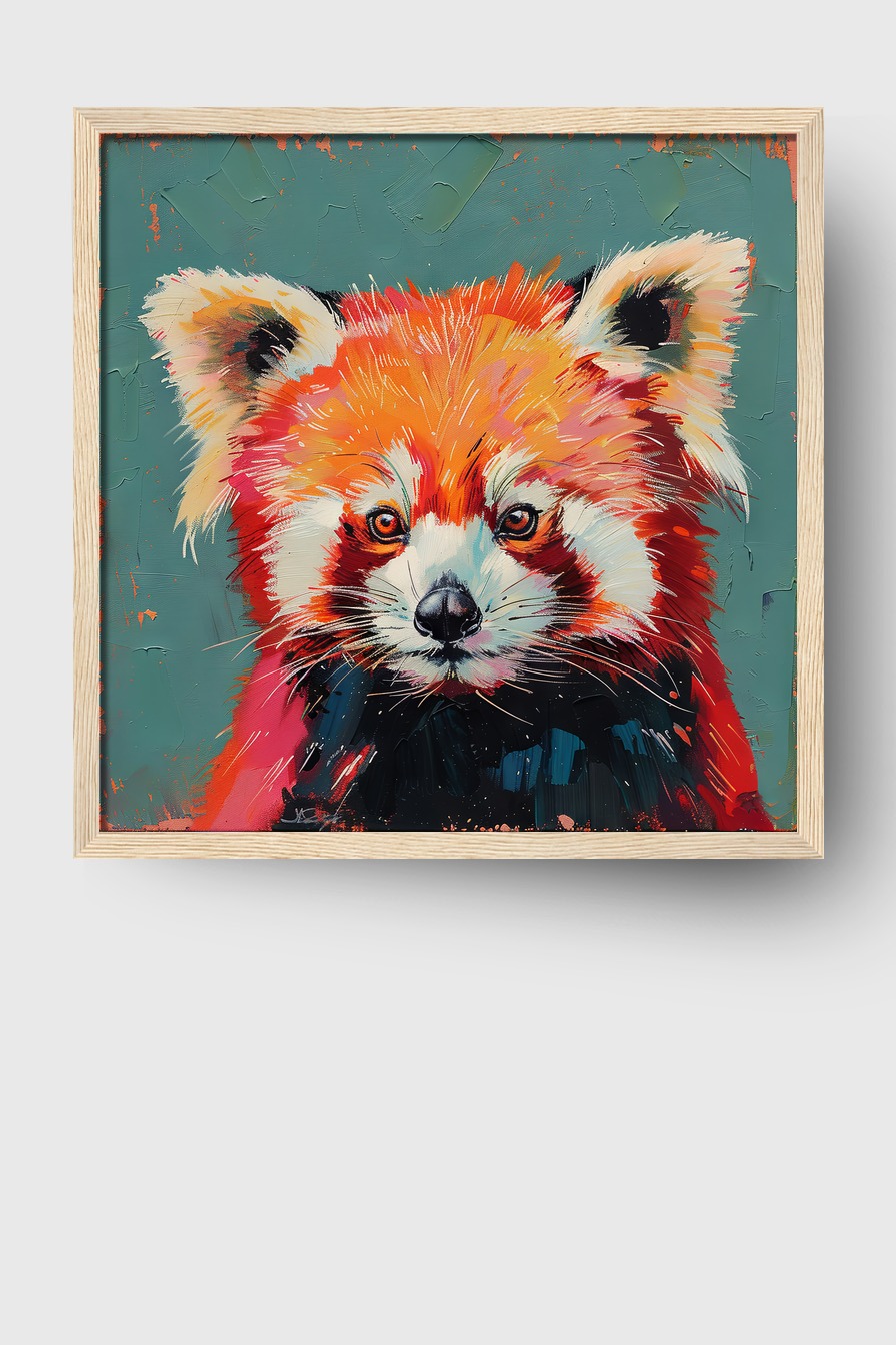 Das Motiv zeigt einen farbigen roten Panda auf einem Poster (170 g/m², halbmatt) hinter bruchsicherem Plexiglas eingerahmt in FSC-zertifiziertem Kiefernholzrahmen. Das Bild kommt inklusive Aufhängeset und ist sofort präsentationsbereit.