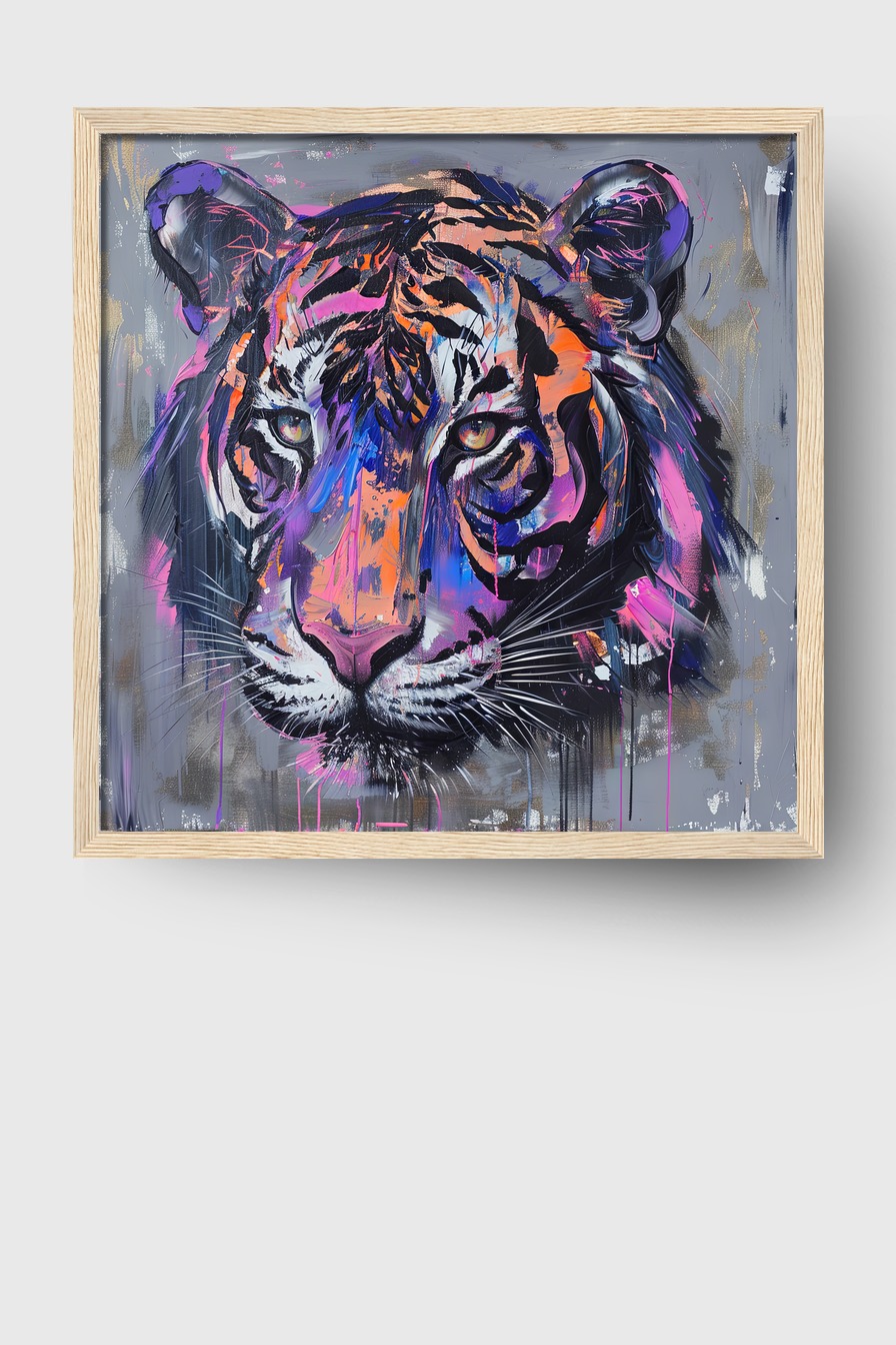 Auf 170 g/m² halbmatter Papier, hinter bruchsicherem Plexiglas in einem Kiefernholzrahmen. Die kräftigen Farben des Tigerkopfes bleiben klar und brillant. Fertig zum Aufhängen.