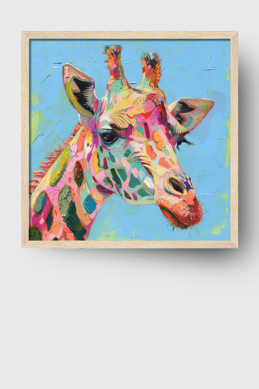 Das farbenfrohe Giraffenmotiv wird hinter bruchsicherem Plexiglas präsentiert. Eingefasst in einen FSC-zertifizierten Kiefernholzrahmen, fertig zum Aufhängen. Die matte Oberfläche bewahrt die Farbintensität ohne Reflexionen.