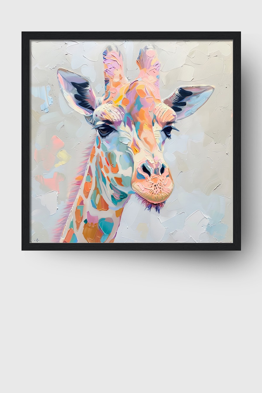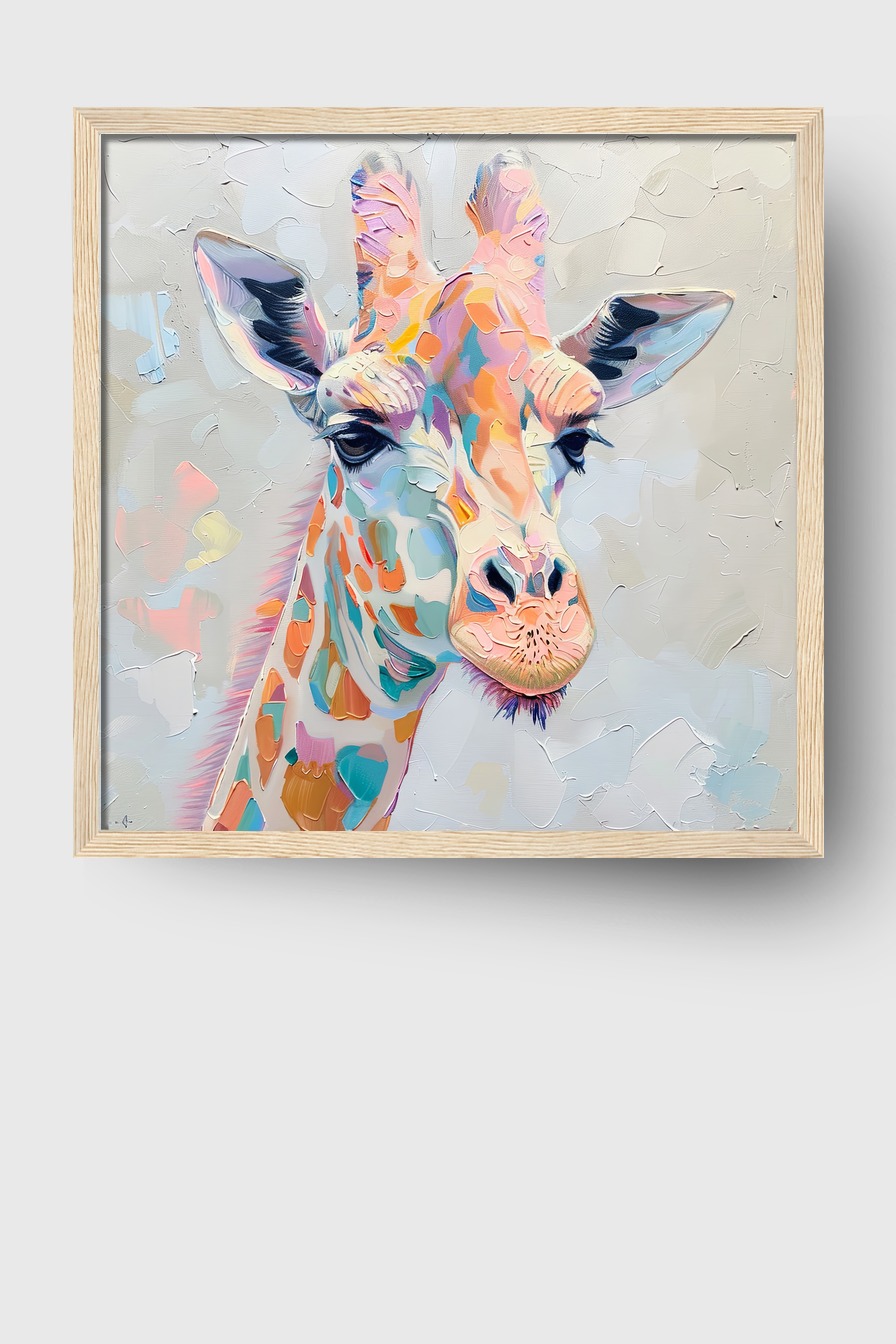 Buntes Giraffenportrait als Poster (170 g/m², halbmatt) hinter bruchsicherem Plexiglas in FSC-zertifiziertem Kiefernholzrahmen. Erhältlich in Schwarz, Weiß, Naturholz und Dunkelbraun. Fertig zum Aufhängen inklusive Aufhängeset.