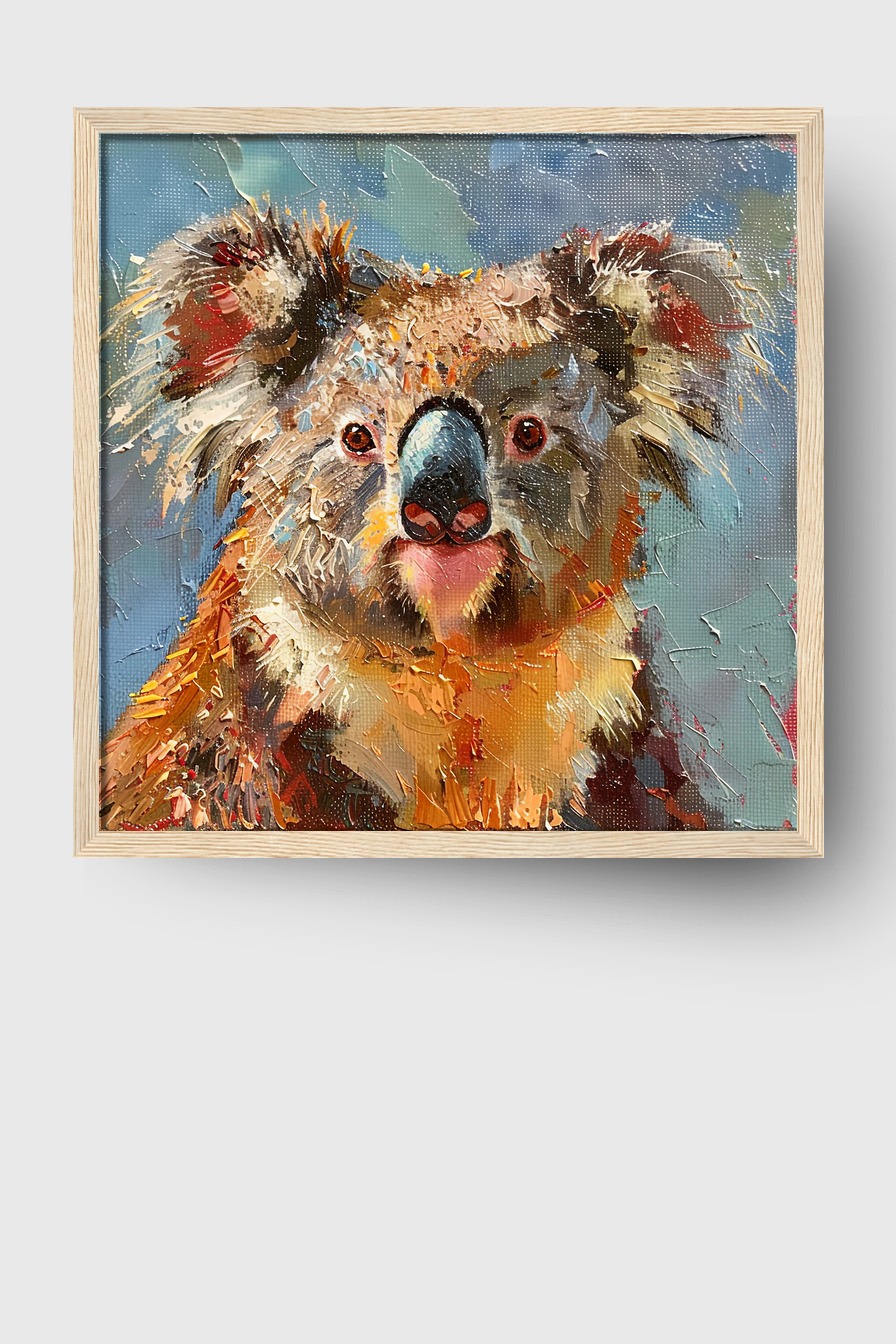 Koalaporträt auf 170 g/m² halbmattem FSC-Papier hinter bruchsicherem Plexiglas. Rahmen aus FSC-Kiefernholz, erhältlich in Schwarz, Weiß, Naturholz oder Dunkelbraun. Fertig zum Aufhängen.