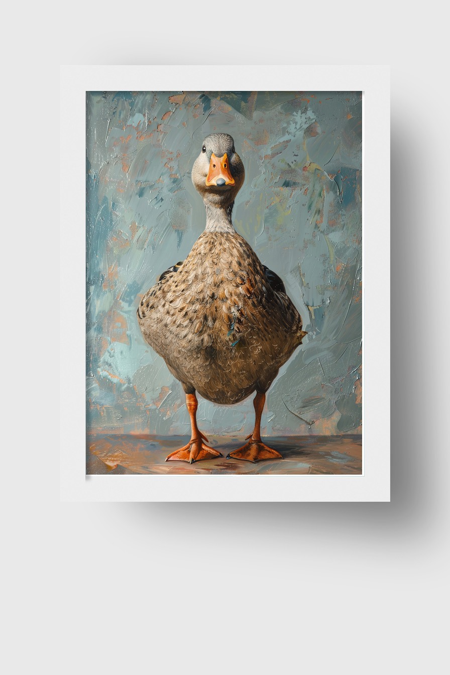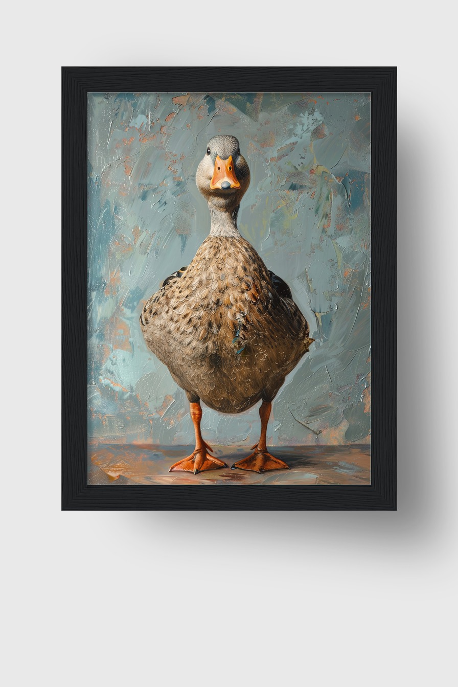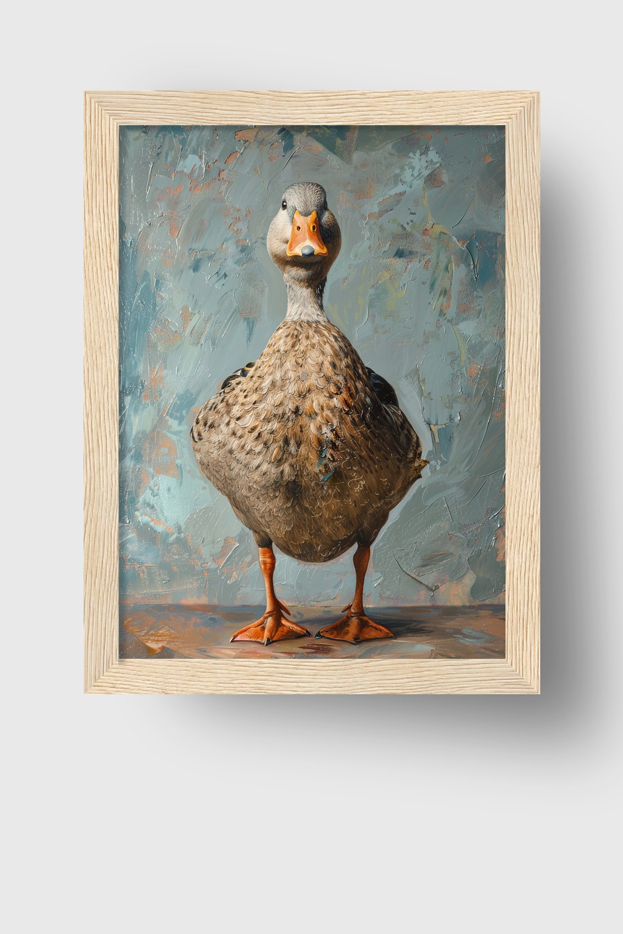Ein detailliertes Entenportrait hinter bruchsicherem Plexiglas. Das Poster (170 g/m² halbmatt) ist in einem schlichten Kiefernholzrahmen (FSC-zertifiziert) gefasst. Lieferbar in Schwarz, Weiß, Naturholz und Dunkelbraun, inklusive Aufhängeset.