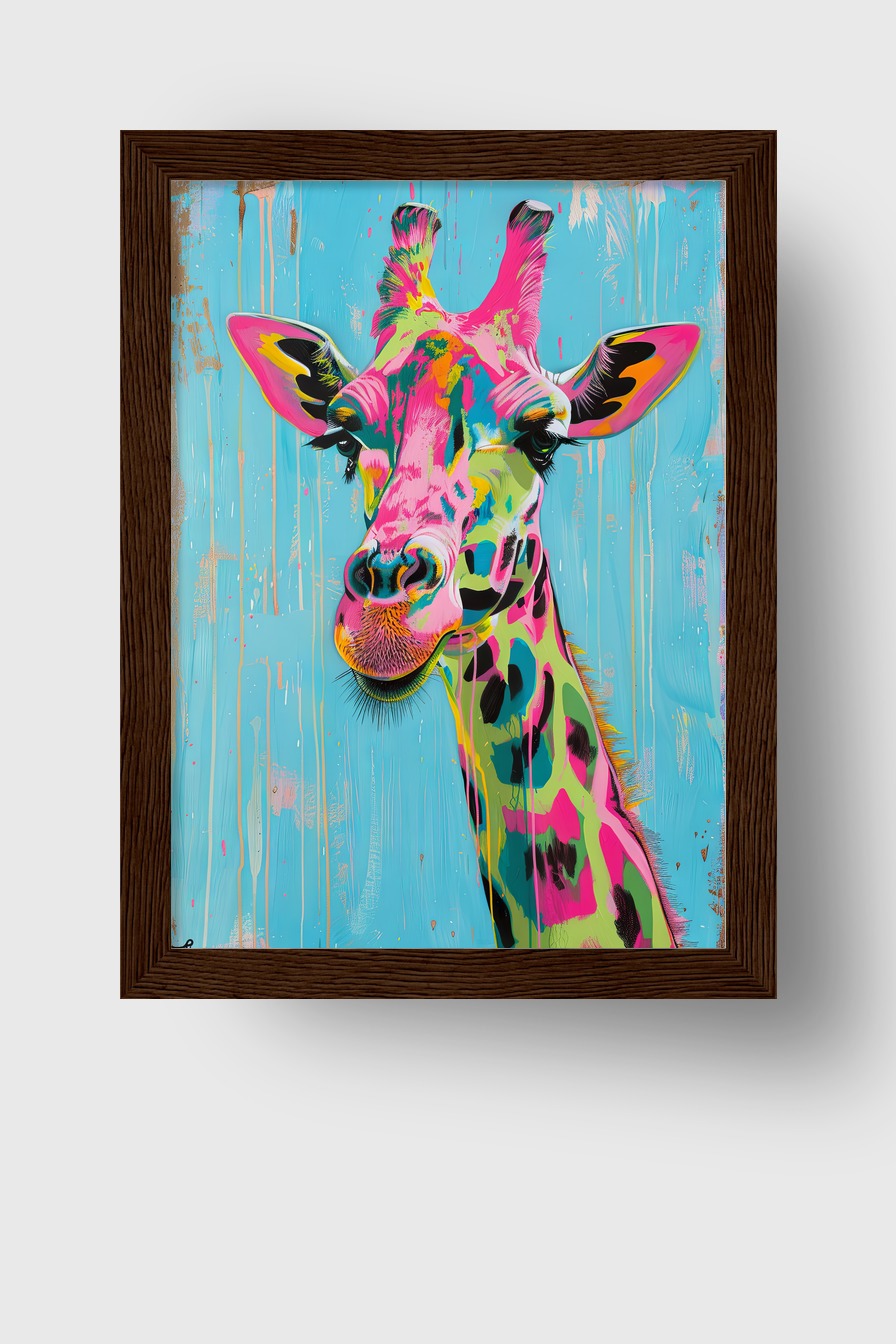Farbenfrohe Giraffe auf halbmattem Papier (170 g/m², FSC-zertifiziert) hinter bruchsicherem Plexiglas. Im Kiefernholzrahmen erhältlich in Schwarz, Weiß, Naturholz und Dunkelbraun. Fertig zum Aufhängen, inklusive Aufhängeset.