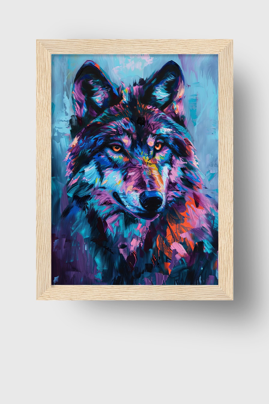 Der bunte Wolf präsentiert sich hinter bruchsicherem Plexiglas in einem Kiefernholzrahmen (FSC-zertifiziert). Erhältlich in Schwarz, Weiß, Naturholz und Dunkelbraun. Fertig zum Aufhängen, inkl. Aufhängeset.