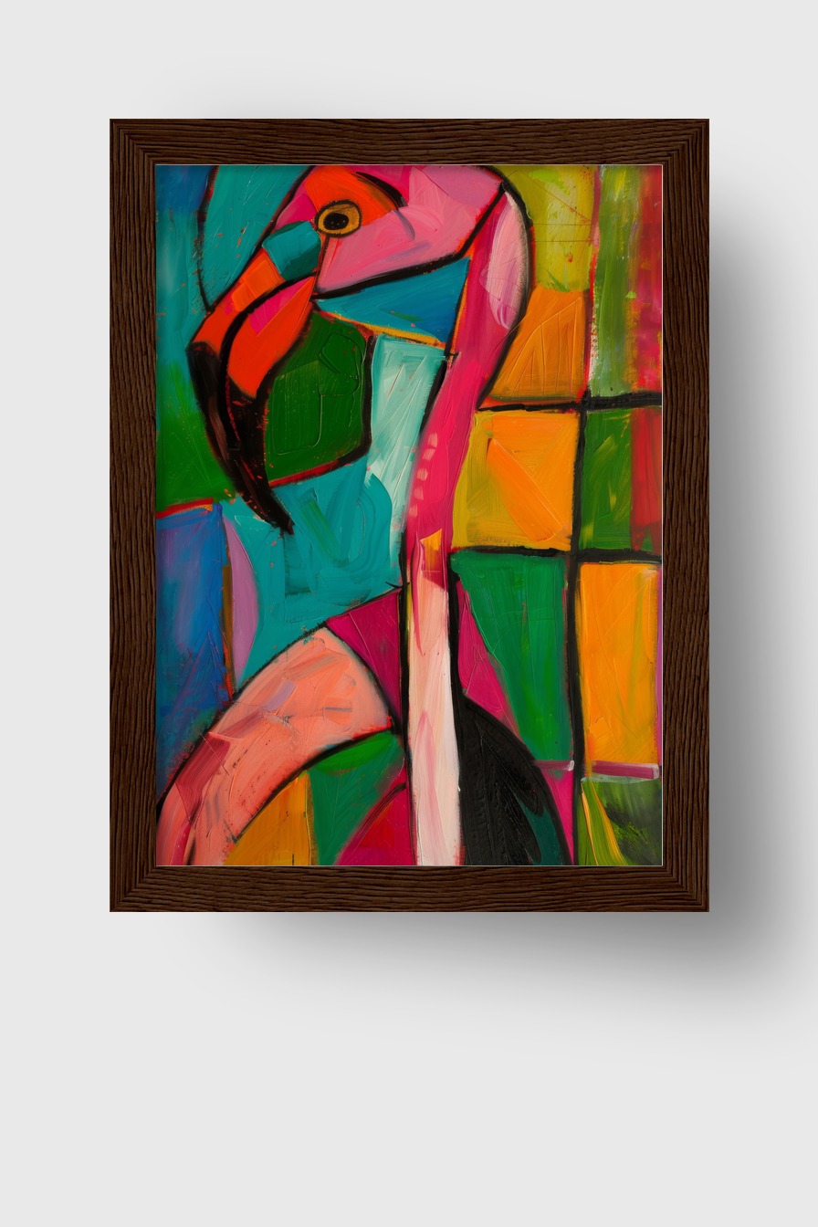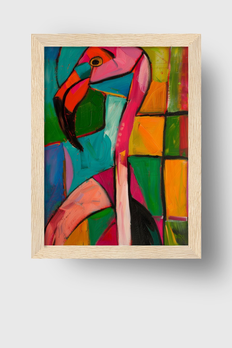 Im Raum zieht der entzerrte Flamingohals mit der scharf umrissenen Augenpartie Blicke auf sich und setzt einem lebendigen Farbkonzept einen dekorativen Akzent.