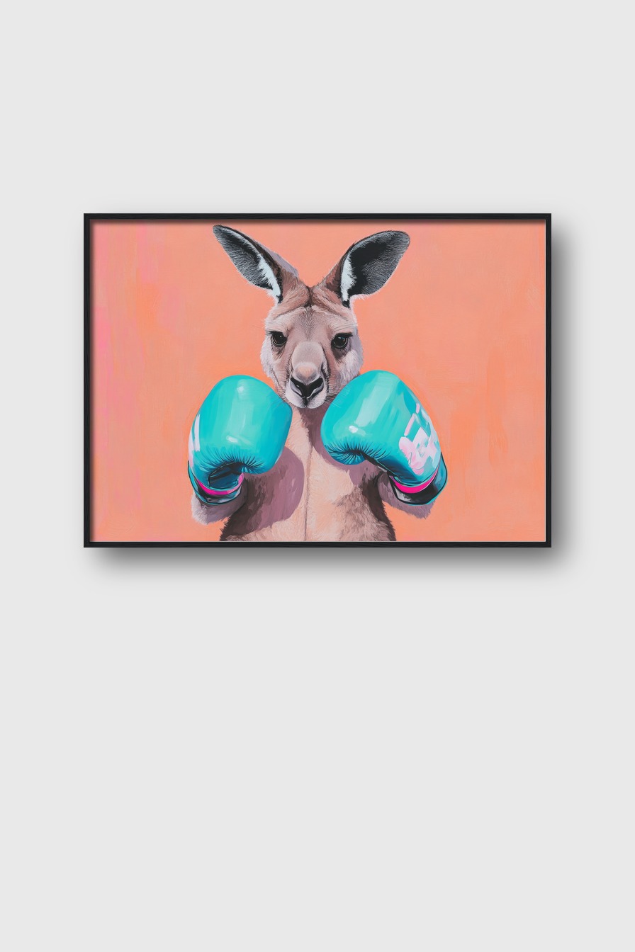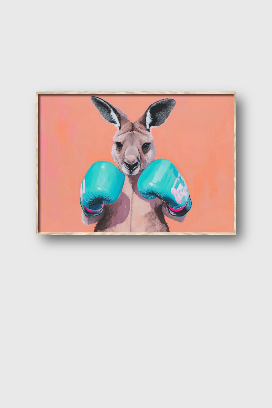 Poster mit einem Känguru in Nahaufnahme, das türkisfarbene Boxhandschuhe trägt vor orangefarbenem Hintergrund, humorvoller Tier-Kunstdruck