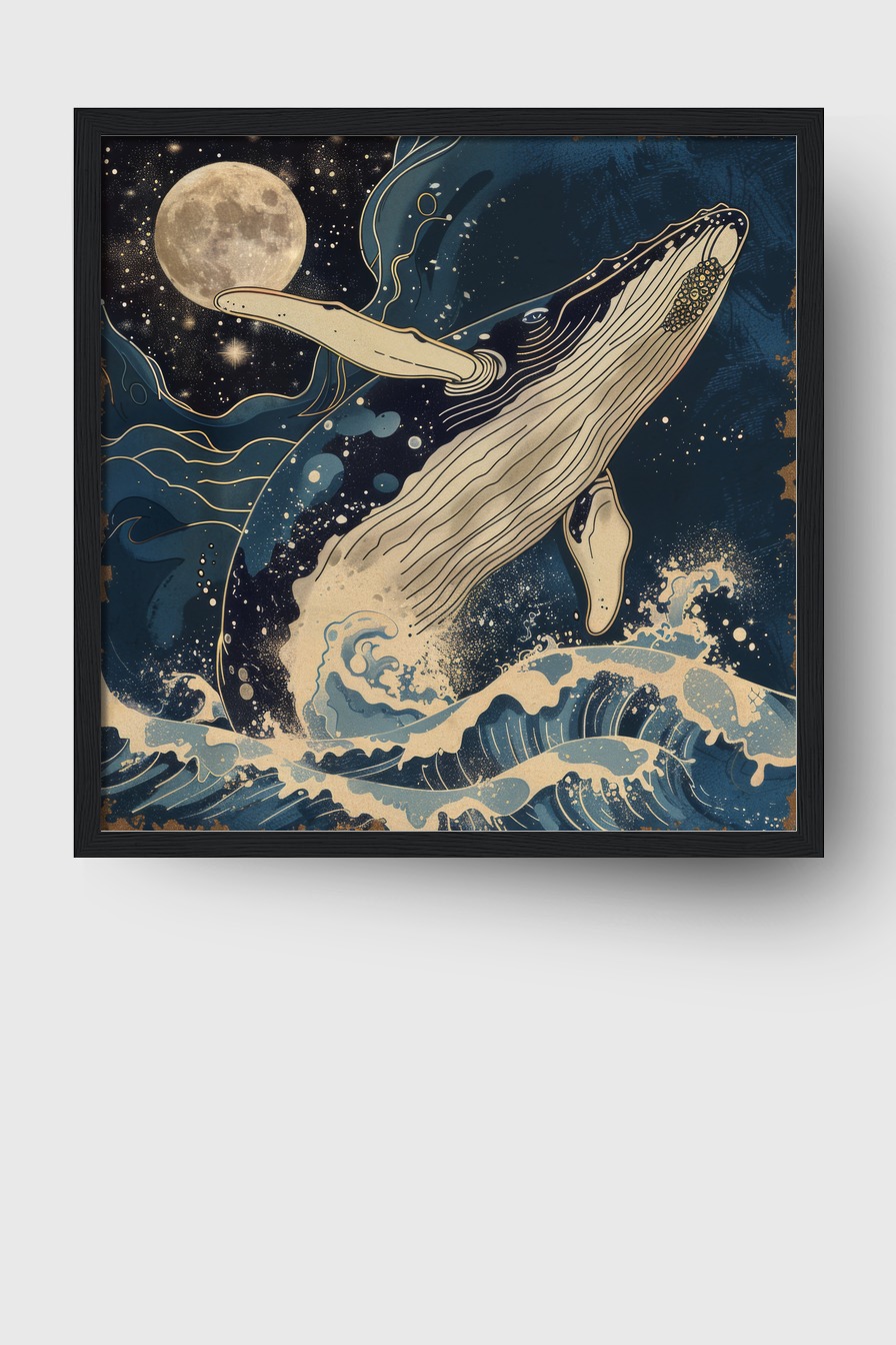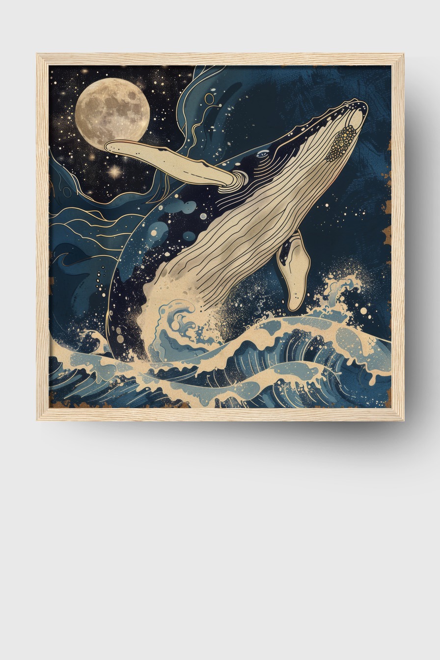 Der große Walbogen hebt sich eindrucksvoll ab und gibt dem Raum eine maritime Stimmung mit Tiefgang. Die Verbindung von Wasser und Nacht macht das Bild zum Blickfang an jeder Wand.