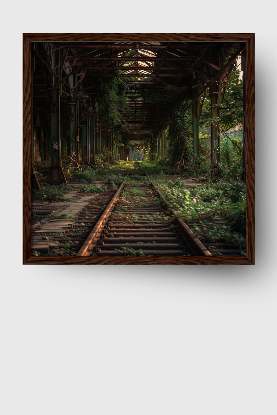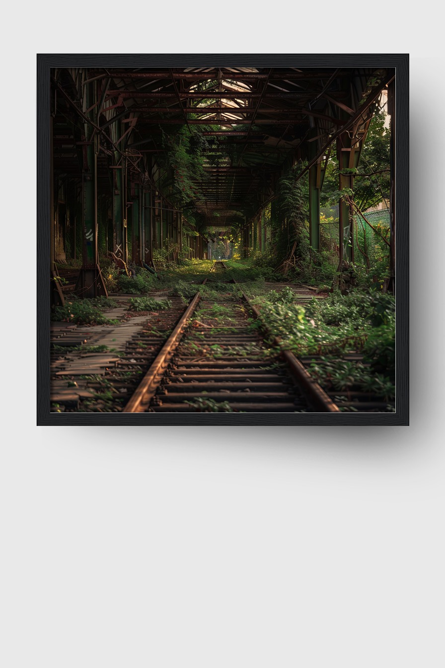 Überwuchertes Gleis, das einen abgelegenen Bahnhof durchzieht und Räumen eine tiefe, fast unberührte Stimmung verleiht.