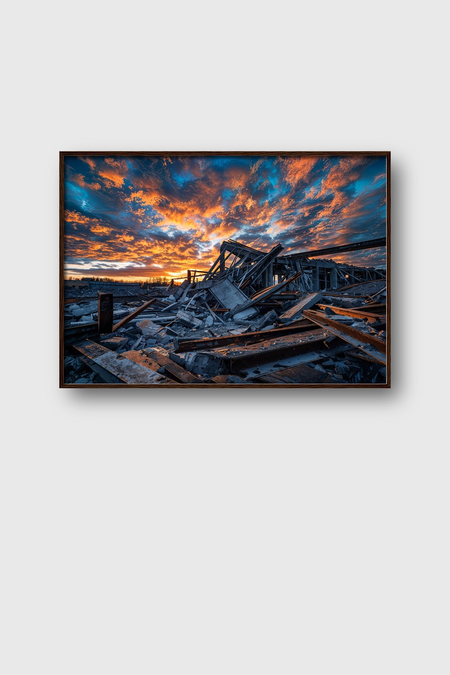 Zerbrochene Gebäudeteile im Vordergrund. Der intensive Sonnenuntergang verleiht dem Bild Tiefe im Raum.