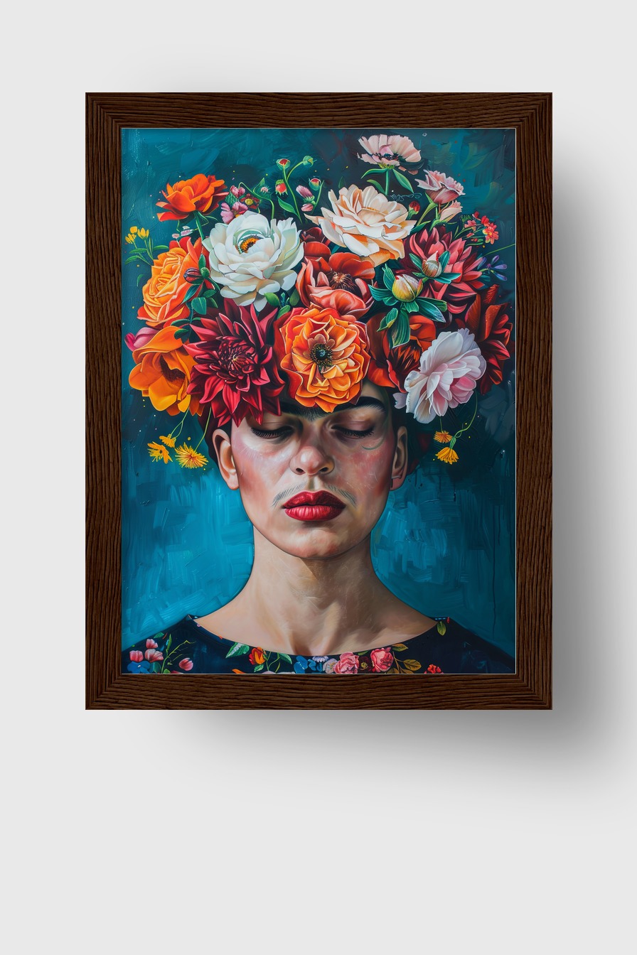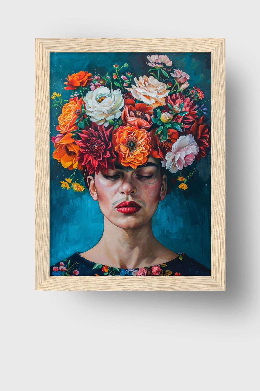 Das Gesicht mit Blumenkranz auf halbmatter Posteroberfläche (170 g/m², FSC-zertifiziert) hinter bruchsicherem Plexiglas in einem Kiefernholzrahmen. Erhältlich in Schwarz, Weiß, Naturholz und Dunkelbraun. Fertig zum Aufhängen.