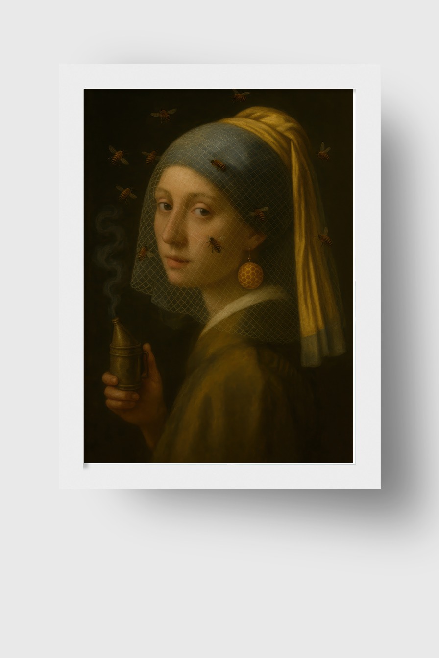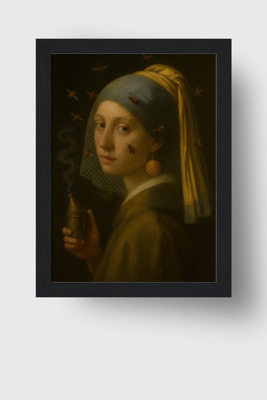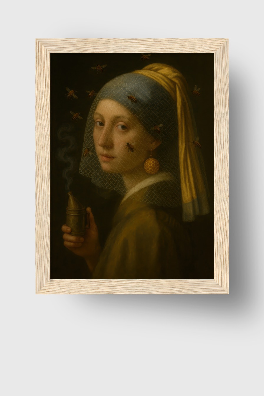 Ein klassisches Porträt mit Bienen, gerahmt in einem Kiefernholzrahmen (FSC) mit bruchsicherem Plexiglas. Poster auf 170 g/m² halbmattem Papier, geliefert fertig zum Aufhängen.