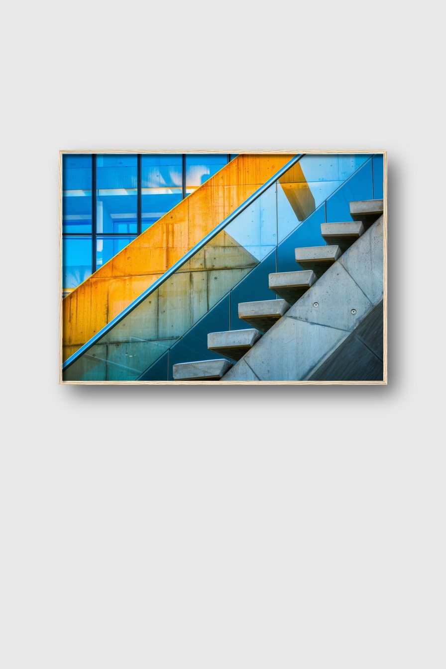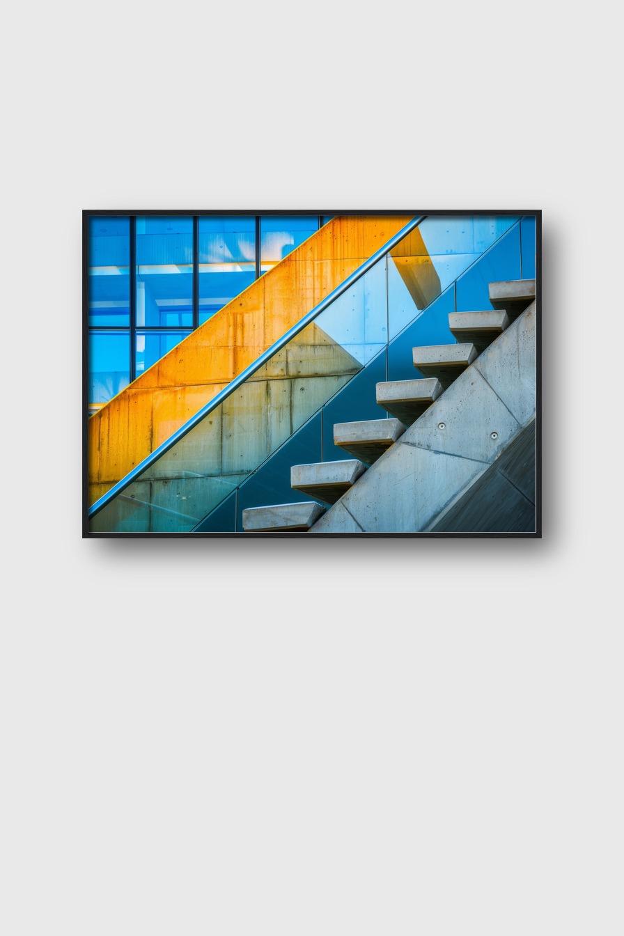 Die klare Struktur der Betontreppe mit Glasgeländer schafft im Raum eine moderne, sachliche Atmosphäre.