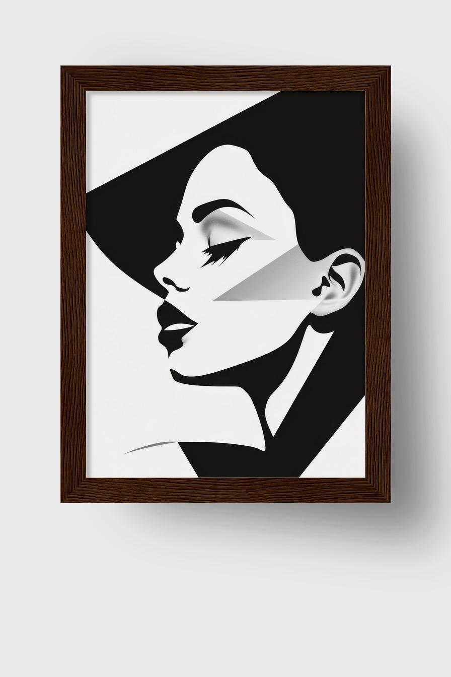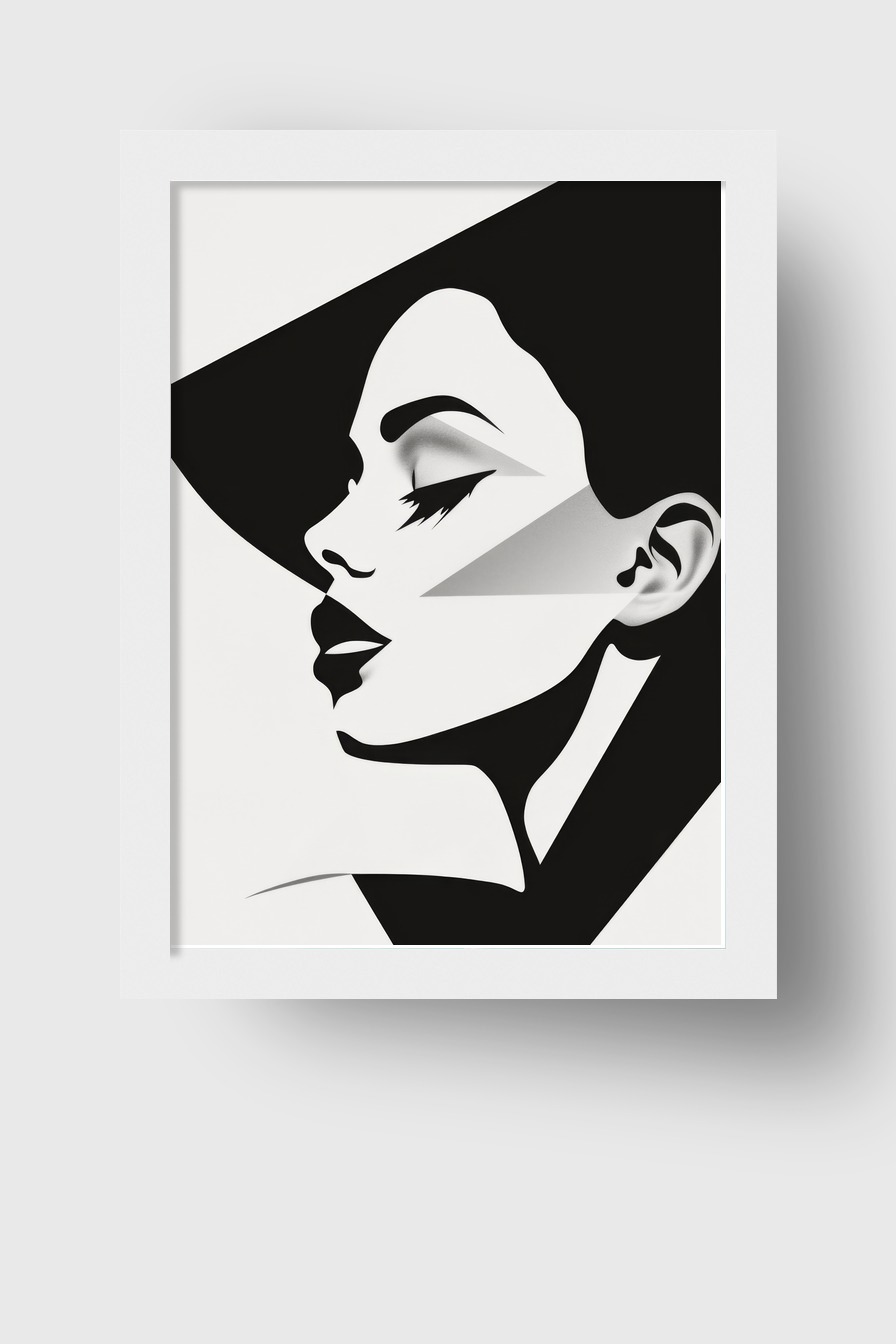 Dieses minimalistische Schwarz-Weiß-Porträt zeigt das Profil einer Frau in klaren Linien. Die reduzierte Gestaltung betont Eleganz und Ruhe.
