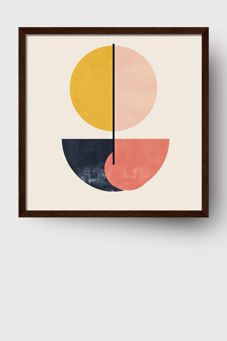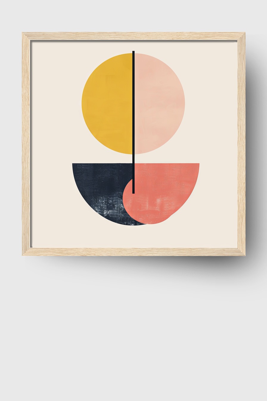 Das Bild zeigt abstrakte geometrische Formen in verschiedenen Farben. Es kombiniert Kreise und Halbkreise mit klaren Linien minimalistisch.