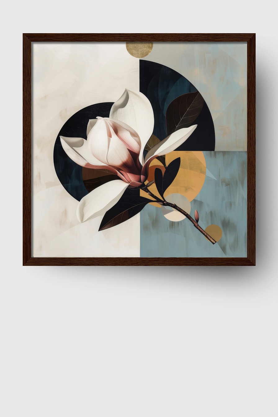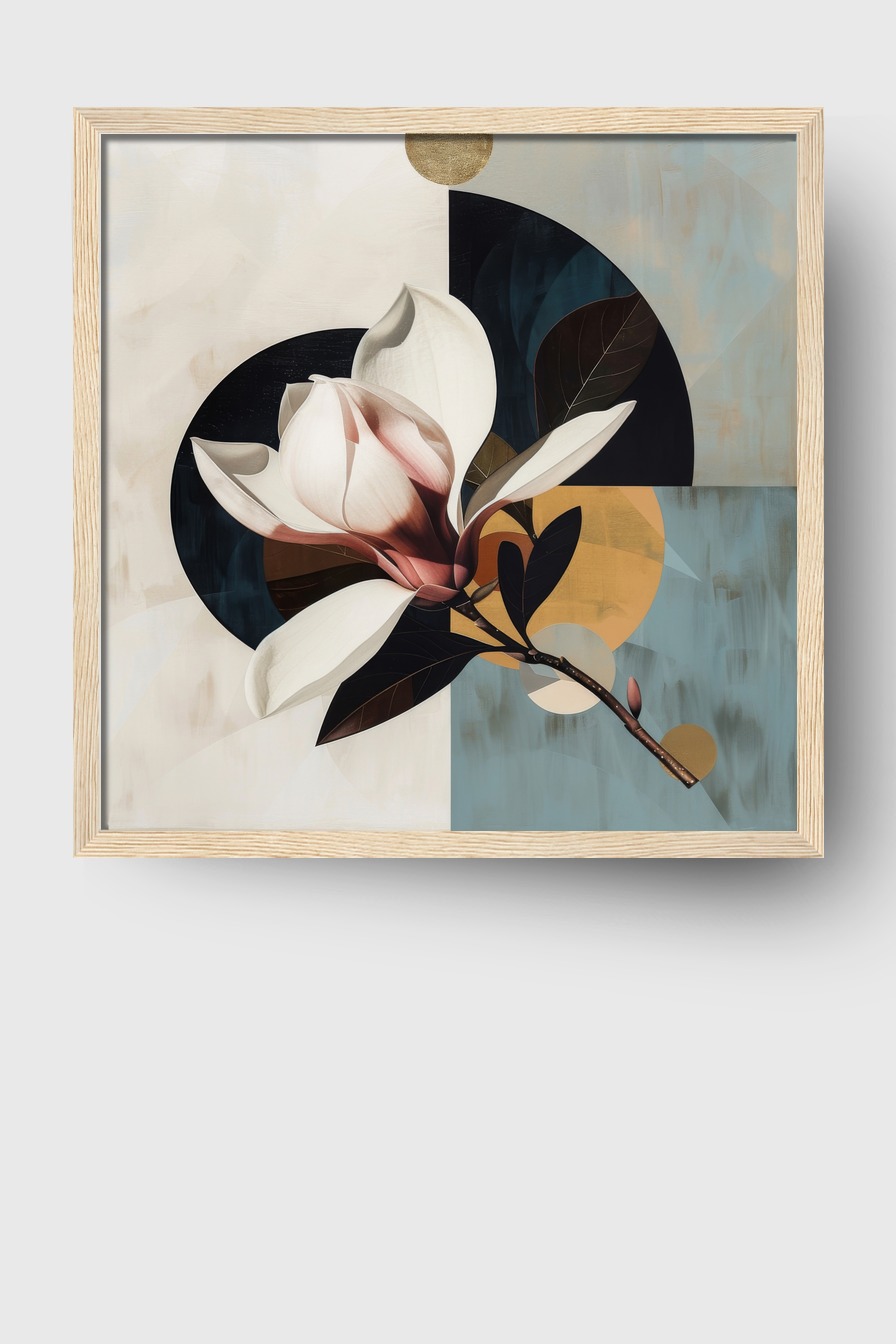 Im Raum wirkt die Magnolie wie ein skulpturales Objekt, das Bild fängt Licht und Schatten ein. Die Kombination aus floraler Natürlichkeit und geometrischer Klarheit schafft eine prägnante Atmosphäre.
